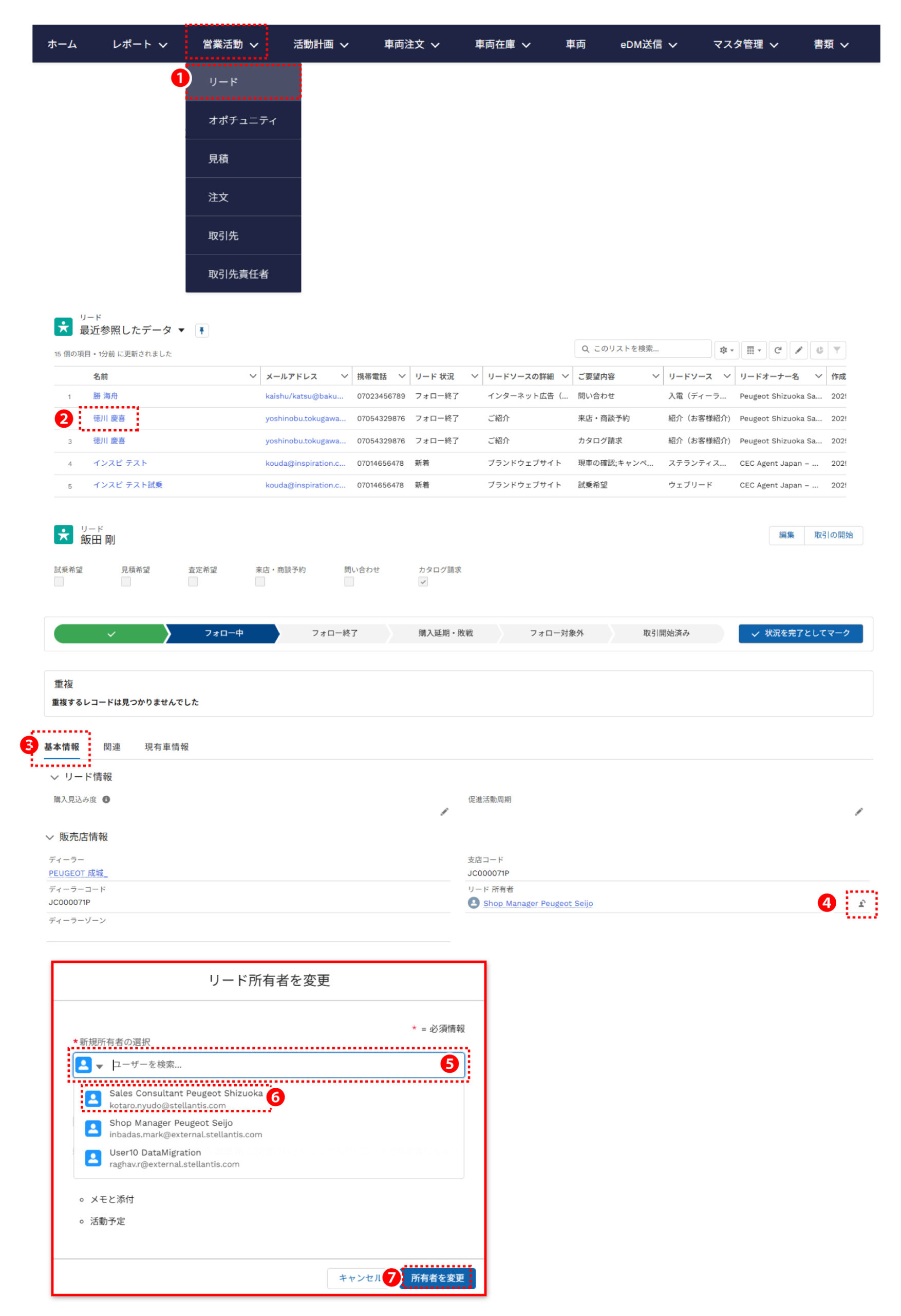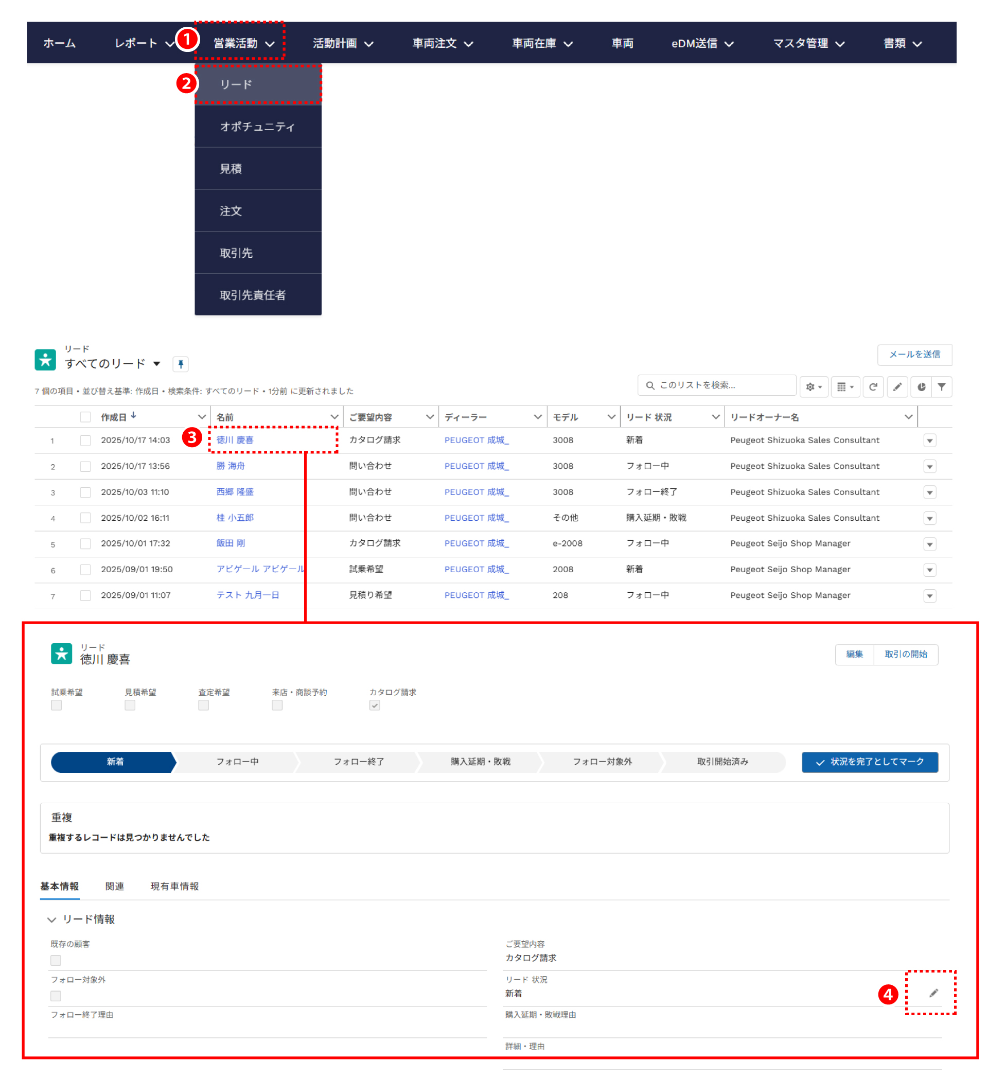 - 店長・セールスマネージャーが担当セールススタッフにリードを割り当てる。