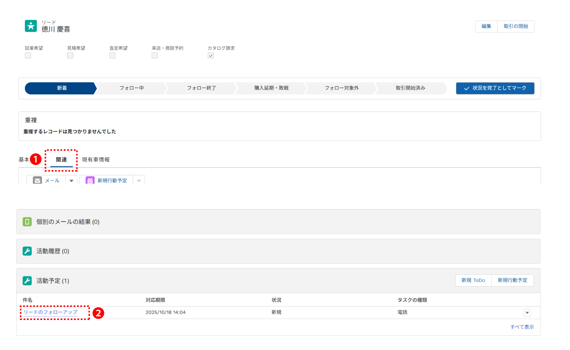 - Stellantisジャパン送客リードの場合は、予めToDo「リードのフォローアップ」が作成されている。セールススタッフはコンタクトの結果をこのToDoを更新し報告する。