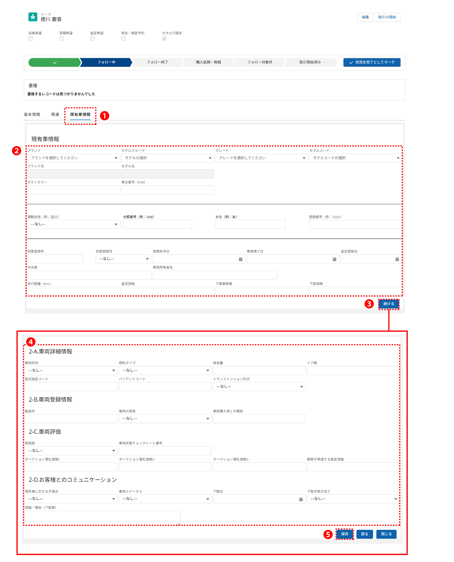 現有車情報は、査定や下取りを行う際 は必須の情報となりますので、お客様とのコミュニケーションを通して情報を取得・入力することをお勧めします。ここで入力した内容は見積・注文書作成時の下取車情報として反映されます。