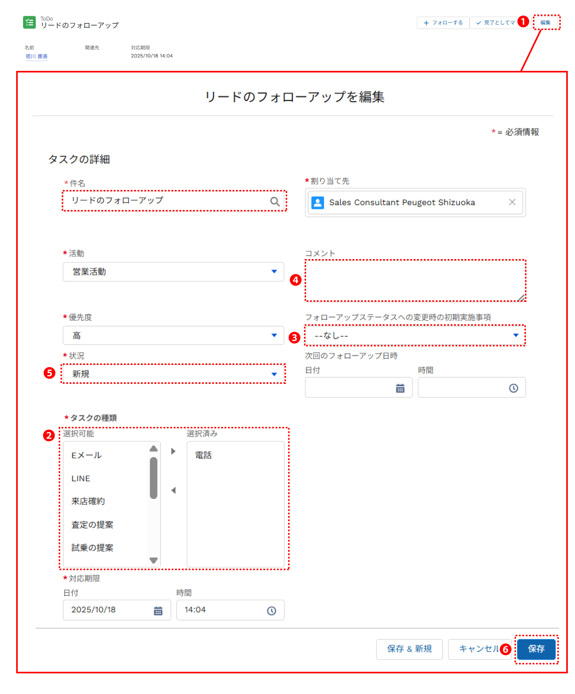❶ 詳細画面の右側の「編集」ボタンをクリックします。「リードのフォローアップを編集」画面が開きます。