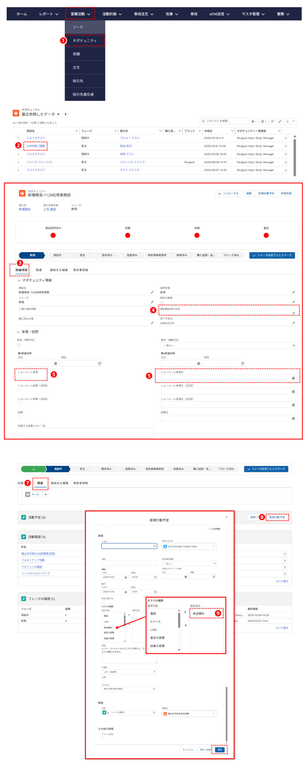 ❻ 加えて、来店時に実施した試乗、査定、見積など商談での実施内容をオポチュニティ上で入力してください。
