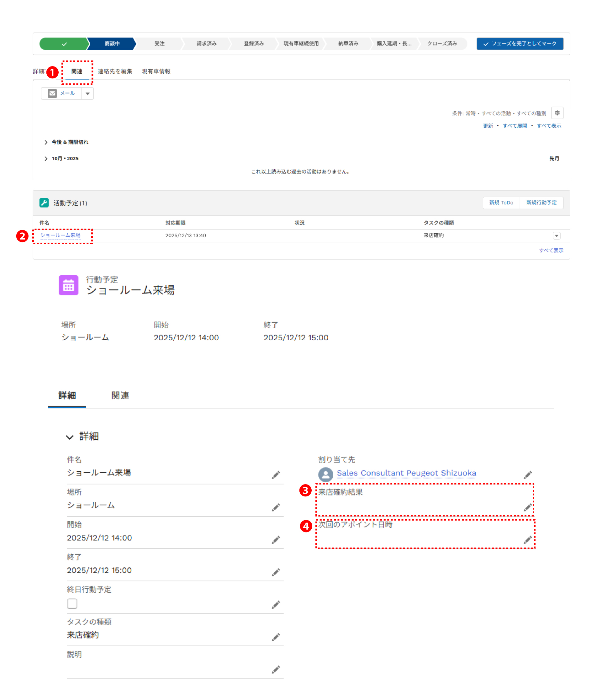 ❶ 来店確約を登録していたオポチュニティ内の「関連」タブをクリックします。