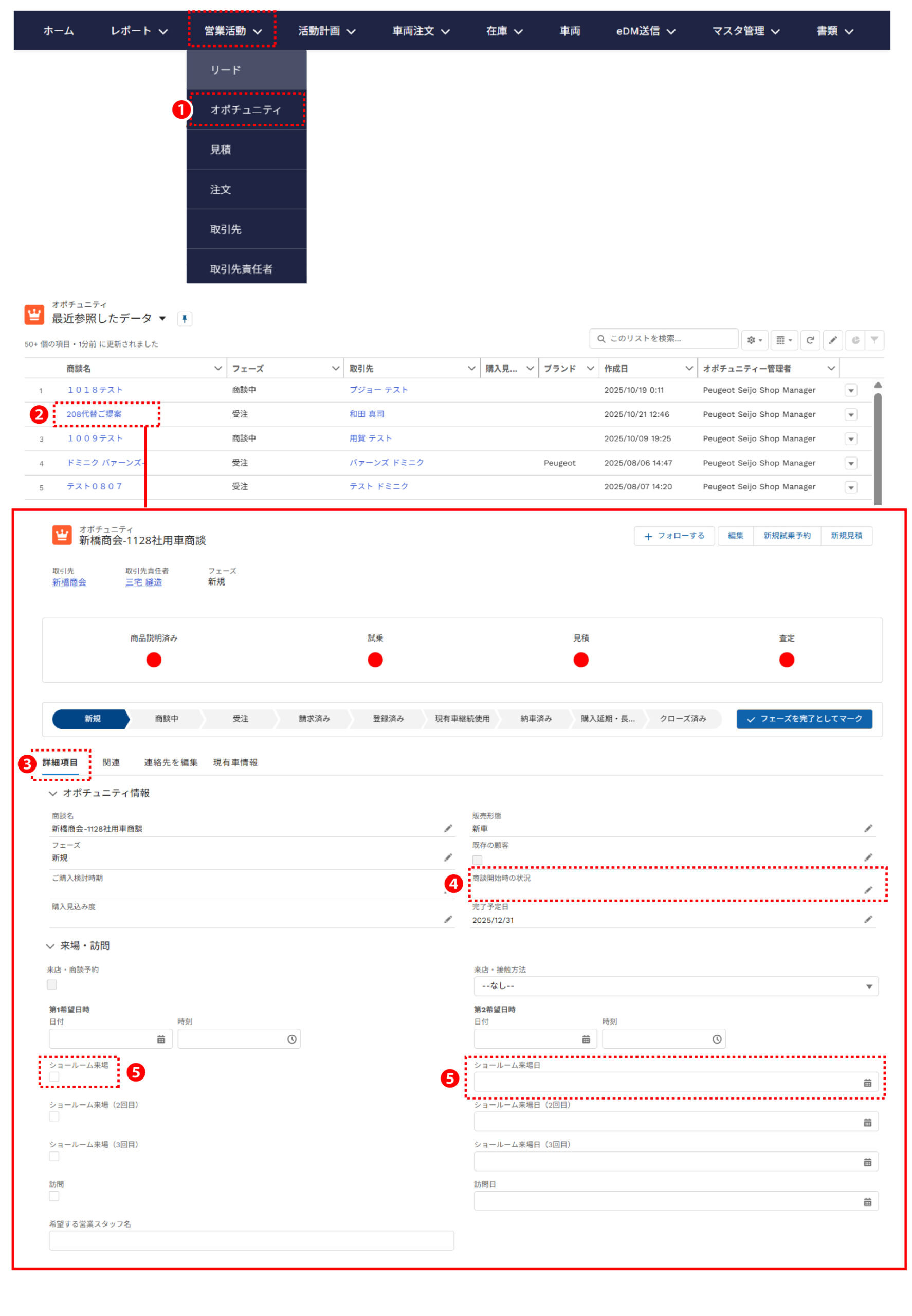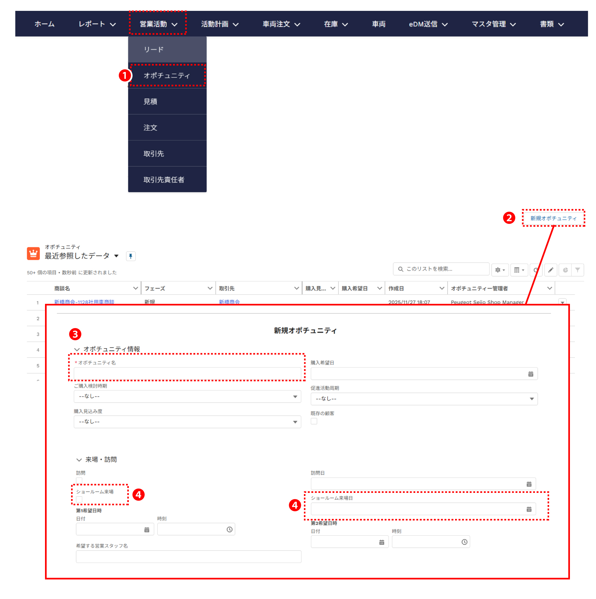 リードをオポチュニティに変換したお客様や既にオポチュニティが作成されているお客様が商談のために来店された時に、オポチュニティに来場を登録します。