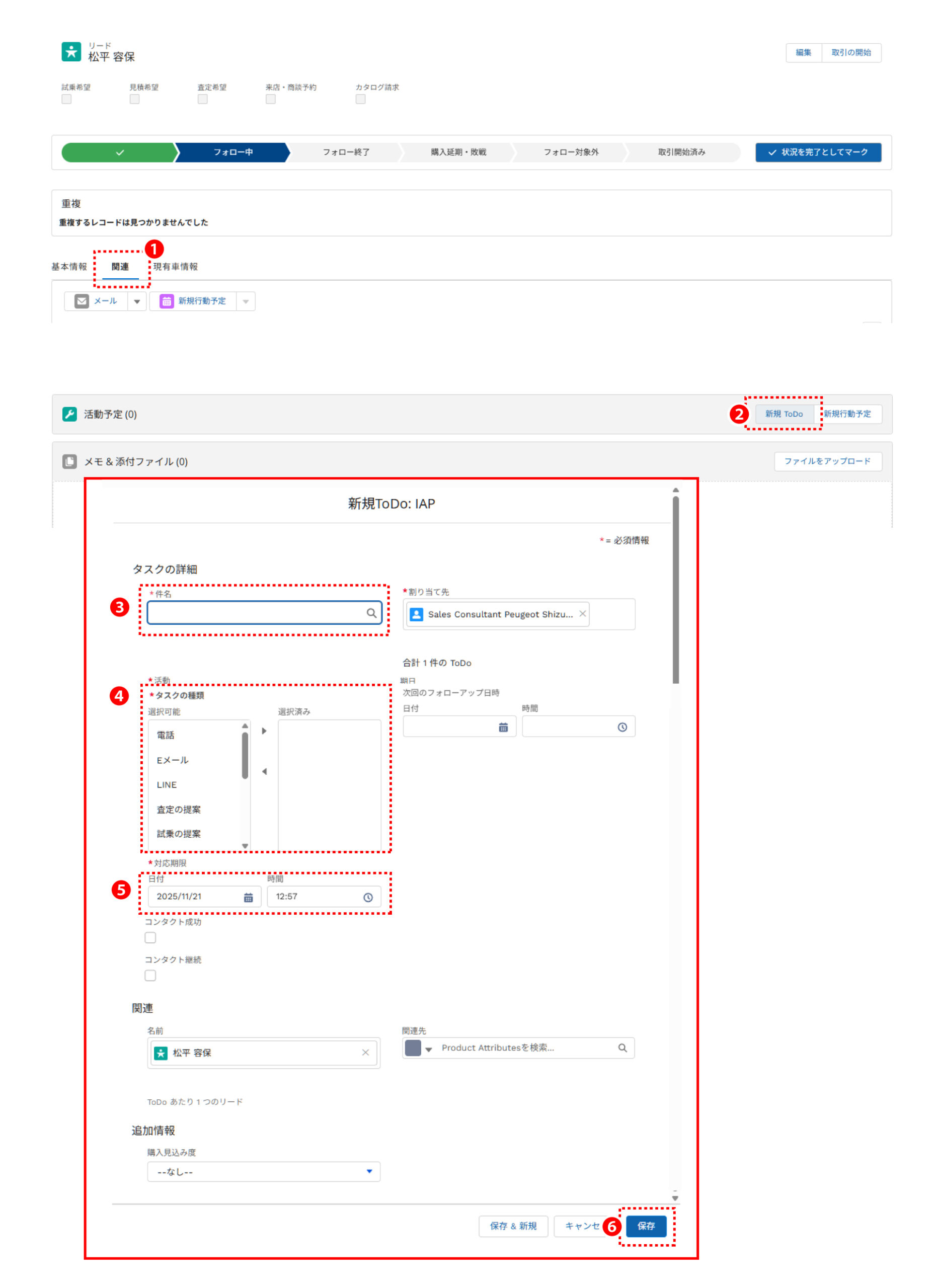 お客様電話を掛けたが繋がらなかった場合など、再度、フォローアップを実施する時に、新たにToDoを作成し、次の活動の予定を立てます。​
