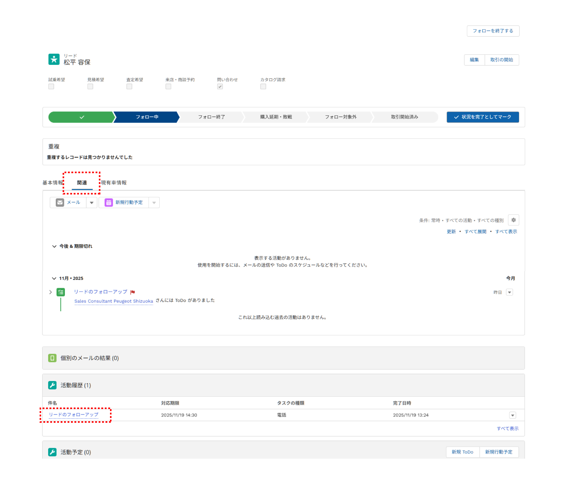 ❶ 開いたリスト画面で、「関連」タブをクリックします。活動の履歴が表示されます。