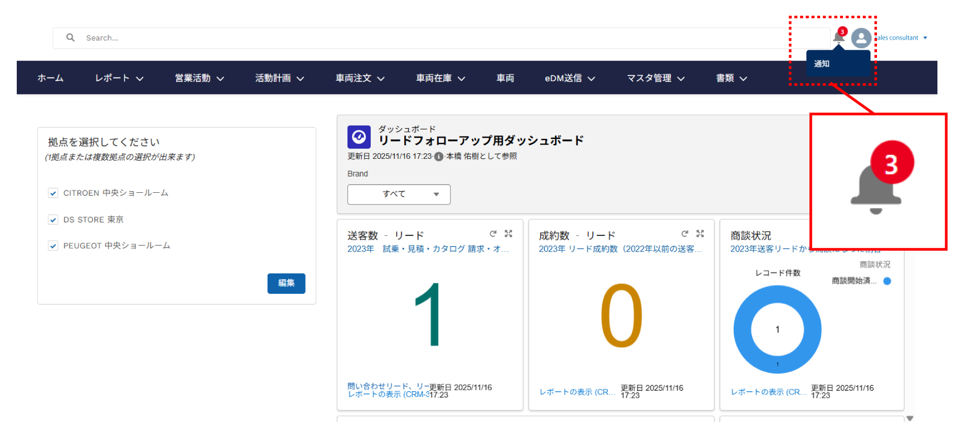 ただし複数拠点を担当されている店長・セールスマネージャーの場合、ベルアイコンの通知は、ホーム画面で選択中の拠点に関する通知のみが表示され、選択を外している拠点に関する通知は表示されませんのでご注意ください。一部の拠点のみを選択して業務をする際は、eメールの通知をご確認ください。