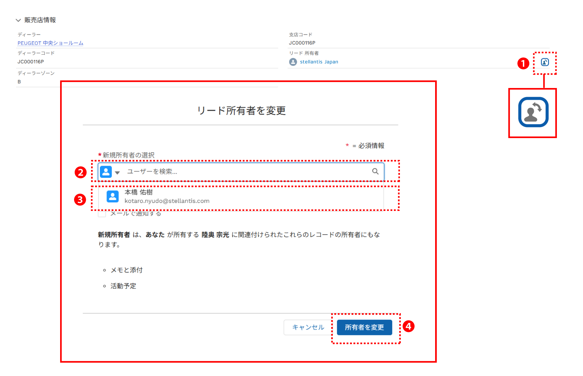 - Stellantisジャパンから送客されるリードの着信通知は店長/セールスマネージャー権限のユーザーにのみ送信されます。リードが送客されるタイミングは決まった時間ではなく、拠点の営業時間内であれば随時送客されますので、会議や休日など、店長が即座に対応できない場合は、拠点内でしっかりと連携をとり、リードを即座にセールスにアサインできるような体制を整えましょう。