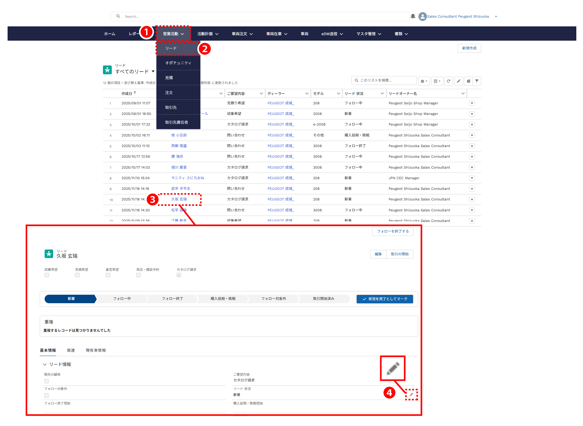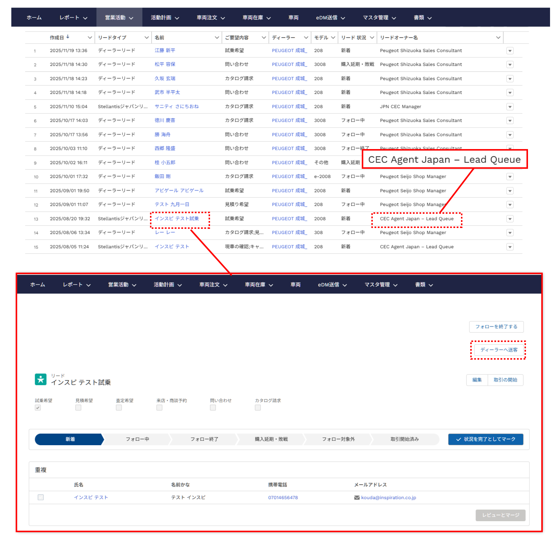 リードオーナー名が「CEC Agent Japan – Lead Queue」となっているリードは、Stellantisジャパン(コールセンター)から送客前のリードです。