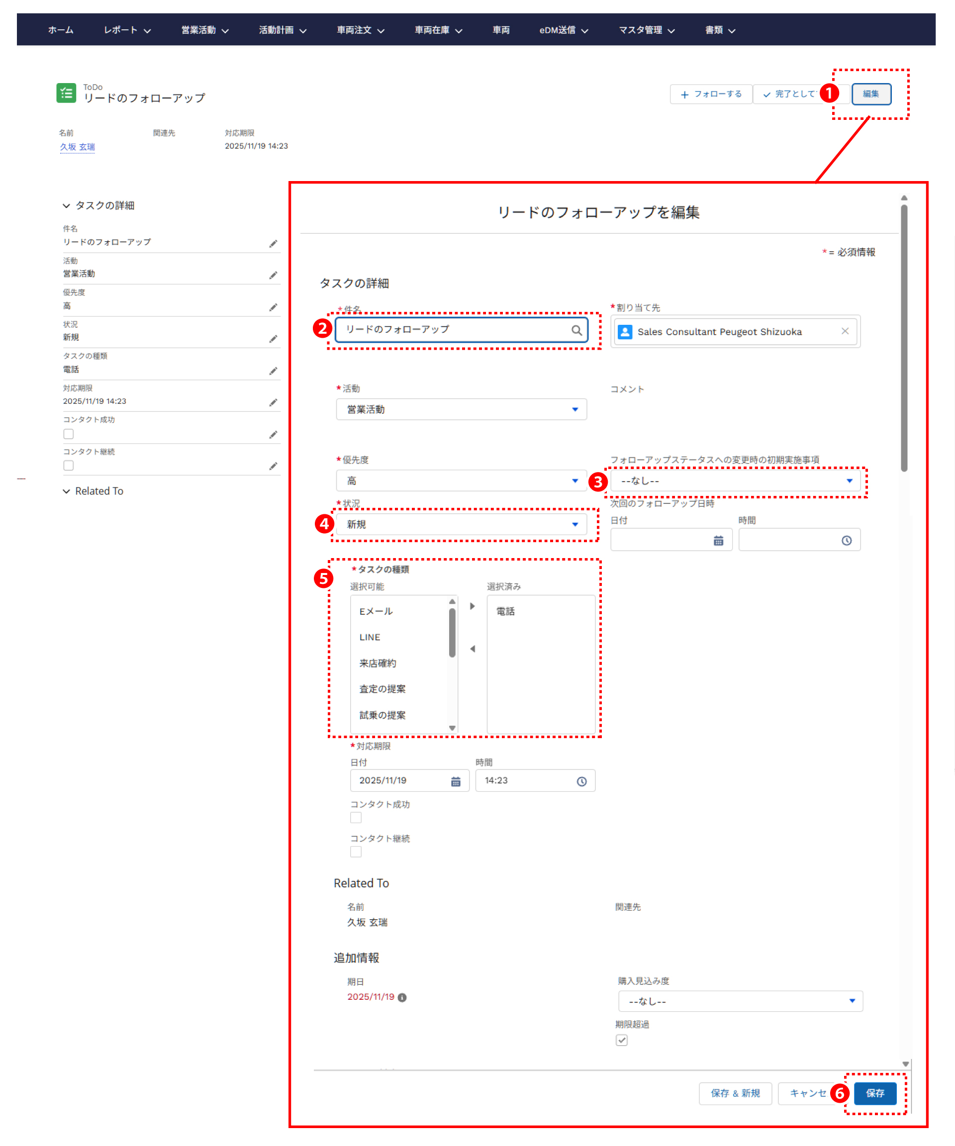 ❶詳細画面の右側の「編集」ボタンをクリックします。「リードのフォローアップを編集」画面が開きます。