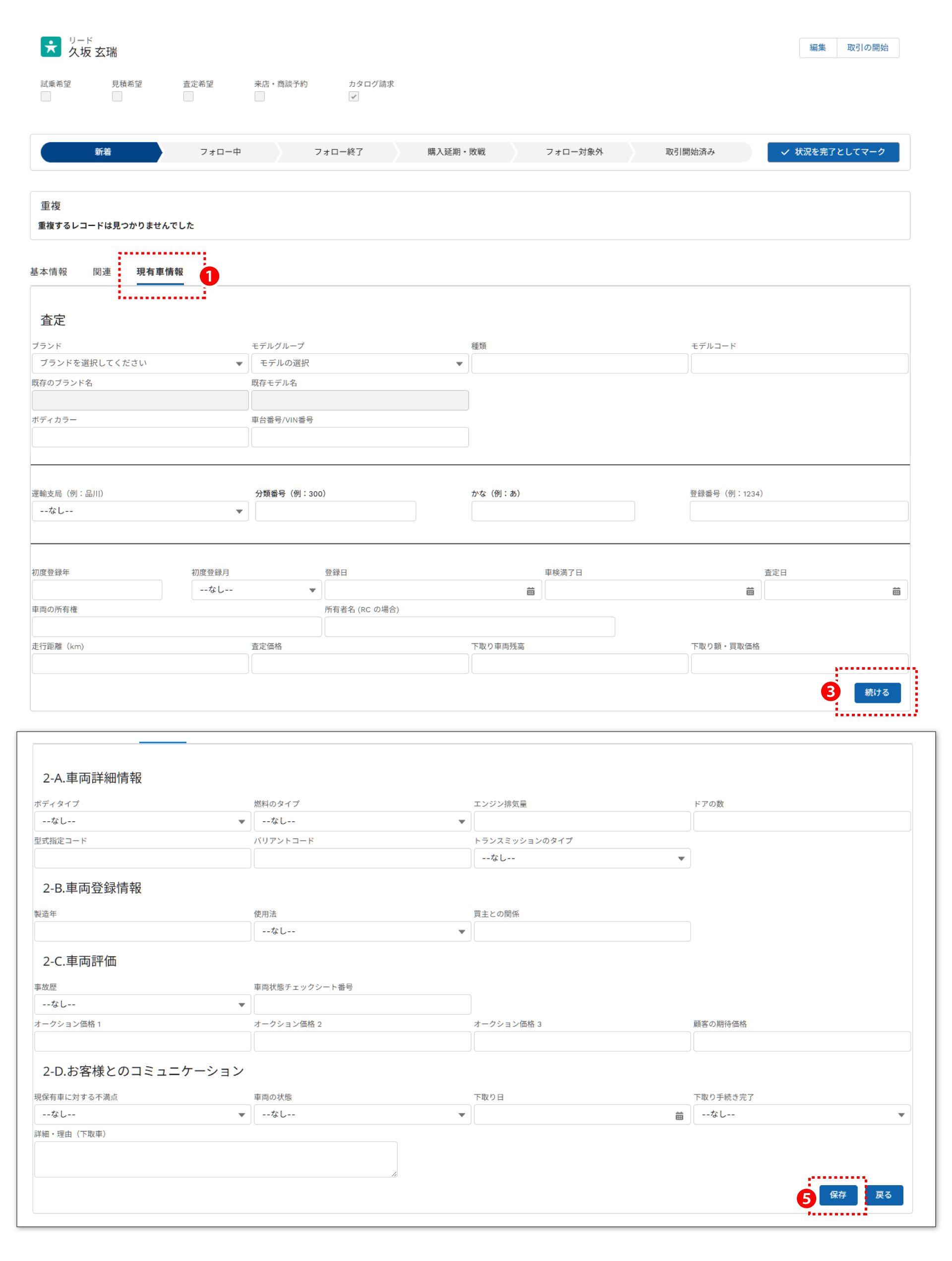 現有車情報は、査定や下取りを行う際 は必須の情報となりますので、お客様とのコミュニケーションを通して情報を取得・入力することをお勧めします。
