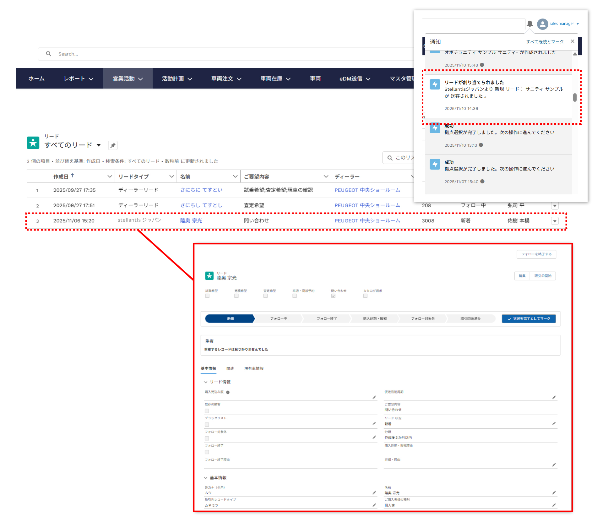 リードが送客されると、eメール及びSalesforce画面上のベルアイコンで店長・セールスマネージャーに通知されます。
