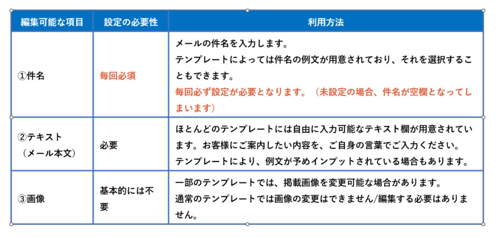 eDMの一斉送信時に編集可能な項目は、以下の通りです。 次ページ以降で説明する手順で、それぞれの内容を編集します。