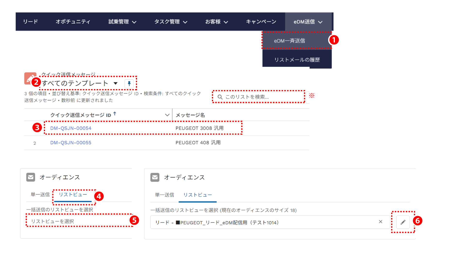 ❸「メッセージ名」の欄でeDMテンプレートの内容を確認し、送信したいテンプレートの「クイック送信メッセージID」をクリックします。eDMテンプレートを選択すると、次に送信先リストを選ぶ画面が表示されます。