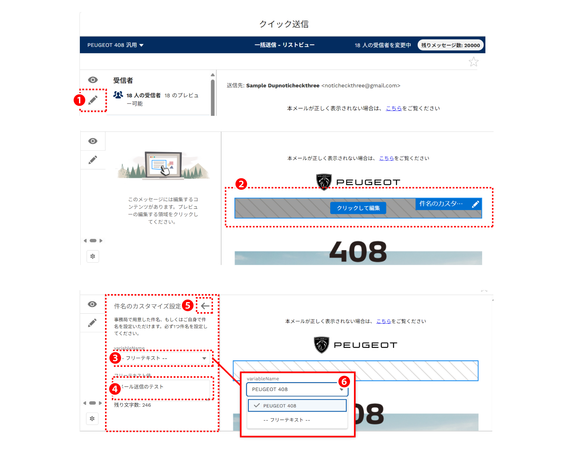 eDMの一斉送信時に編集可能な項目は、以下の通りです。 次ページ以降で説明する手順で、それぞれの内容を編集します。