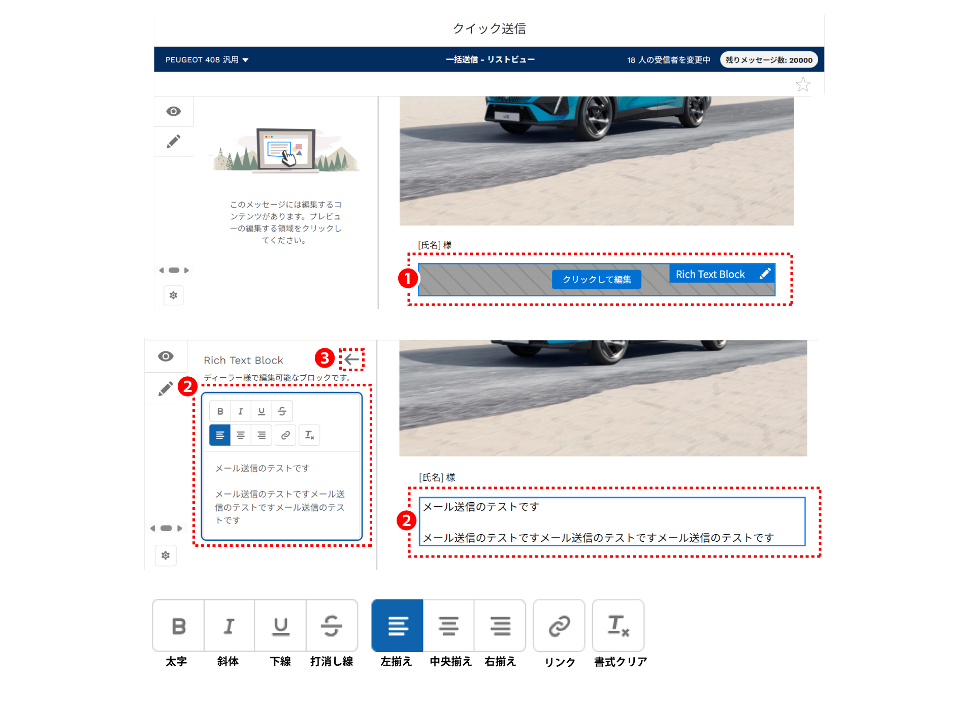 ❶ eDM編集画面に表示されているプレビュー上にある「Rich Text Block」の枠上で、「クリックして編集」をクリックすると、テキストの入力画面が表示されます。(「Rich Text Block」は多くの場合eDMテンプレートのトップ画像下に配置されて います。)