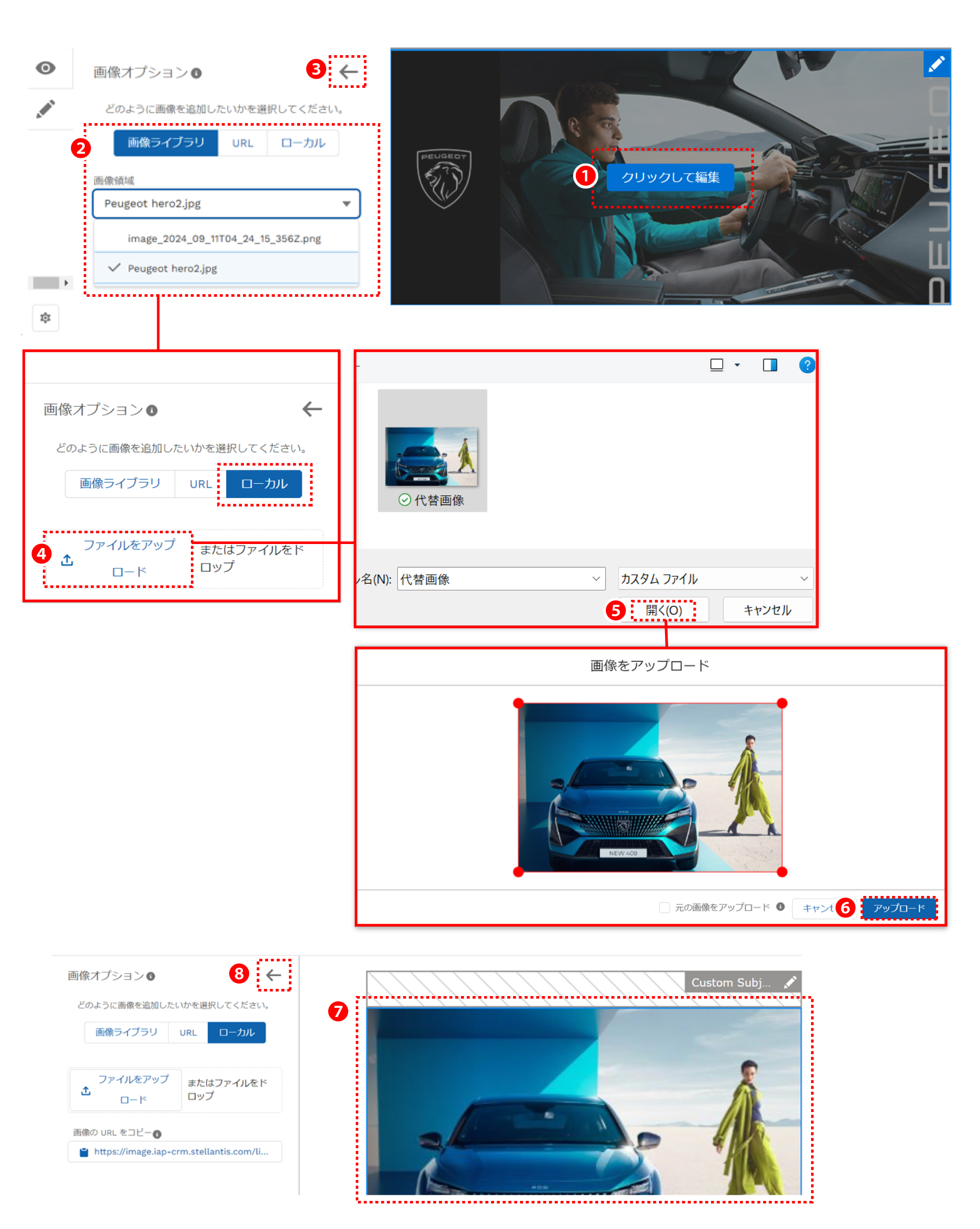 ❶ テンプレートに変更可能な画像が含まれる場合は、eDM編集画面に表示されているプレビュー上の画像の右上に鉛筆アイコンが表示されます。画像上の「クリックして編集」をクリックすると、画像の選択画面が表示されます。画像を変更する際は、「あらかじめ用意された画像から選択」と「任意の画像をアップロードして選択」の2通りの方法があります。