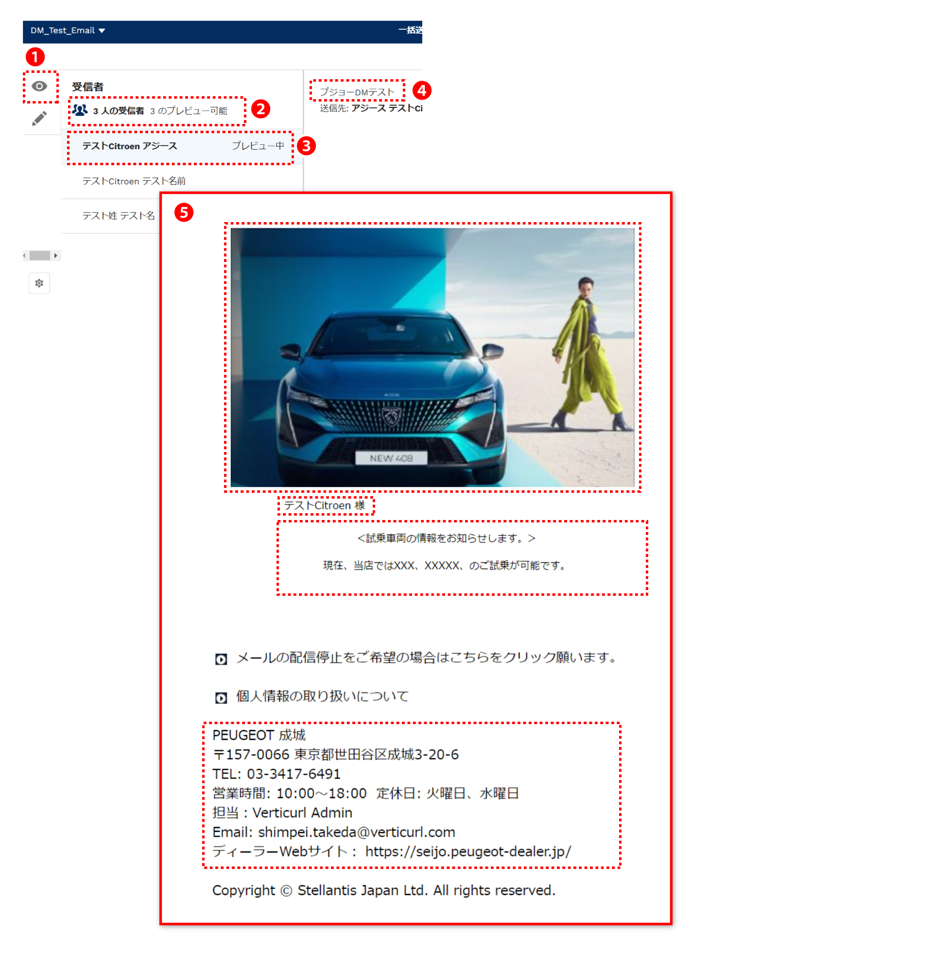 ❸「受信者」の中から任意のお客様を1件選択して、右側のプレビュー画面で実際に配信されるメール内容の最終確認をします。 (すべての送信先に対する表示を確認する必要はありません。送信先リストに含まれるお客様のうち、最初の100名までがプレビュー確認可能です。)