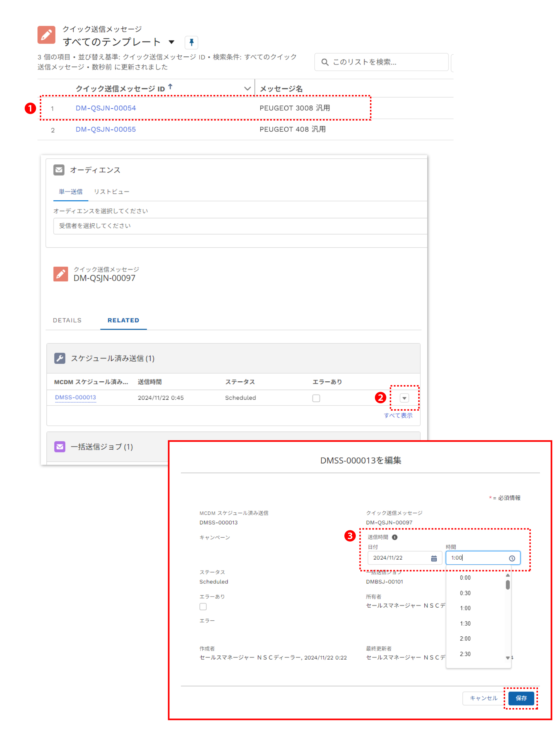 ❸ 送信時間を変更し、「保存」をクリックするとスケジュール送信の送信日時が 変更されます。