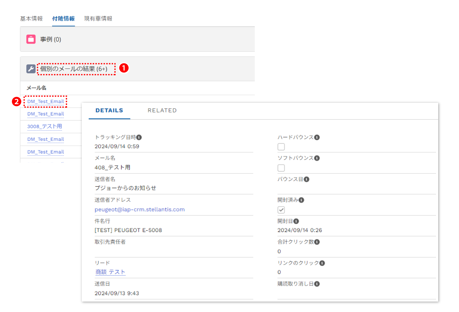 ❶個別のお客様のリード/オポチュニティ/取引先/取引先責任者画面の「関連」タブの 中にある「個別のメールの結果」にて、過去に送信されたeDM一斉送信の履歴を確認することができます。