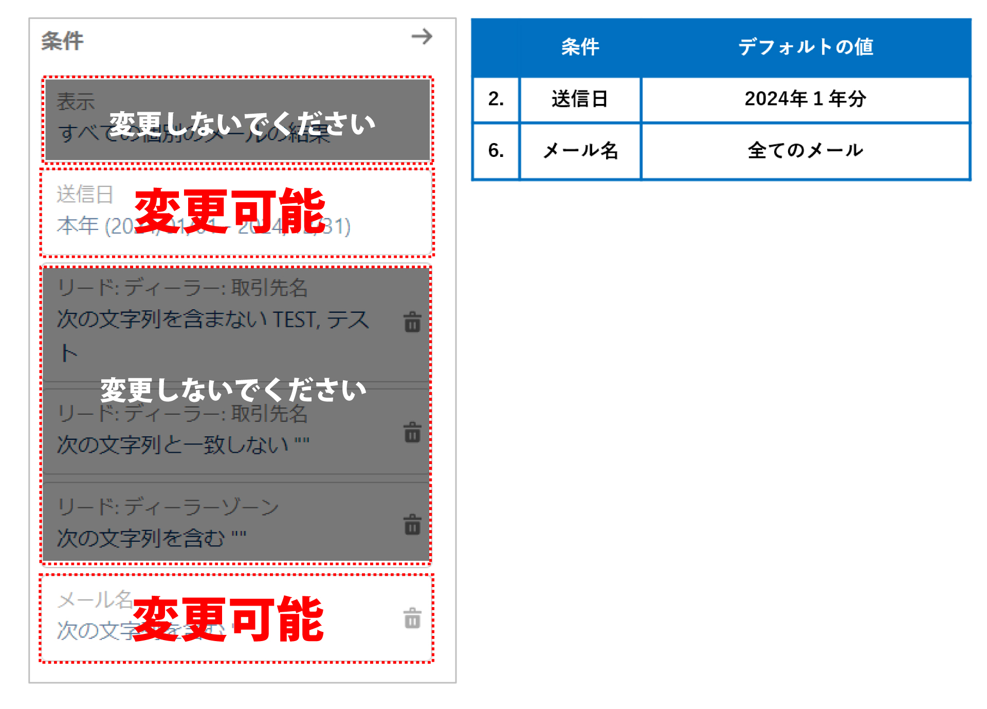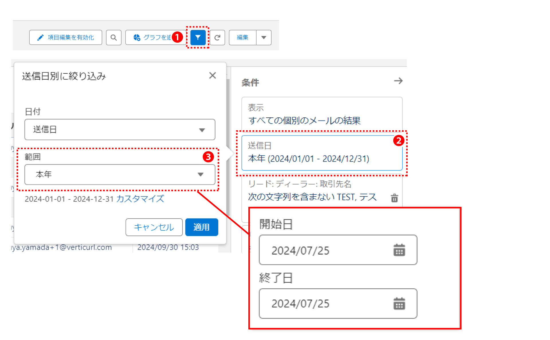 レポートを保存した時点で自動で過去の配信結果が表示されますが、フィルター条件を使って情報を絞ることが可能です。