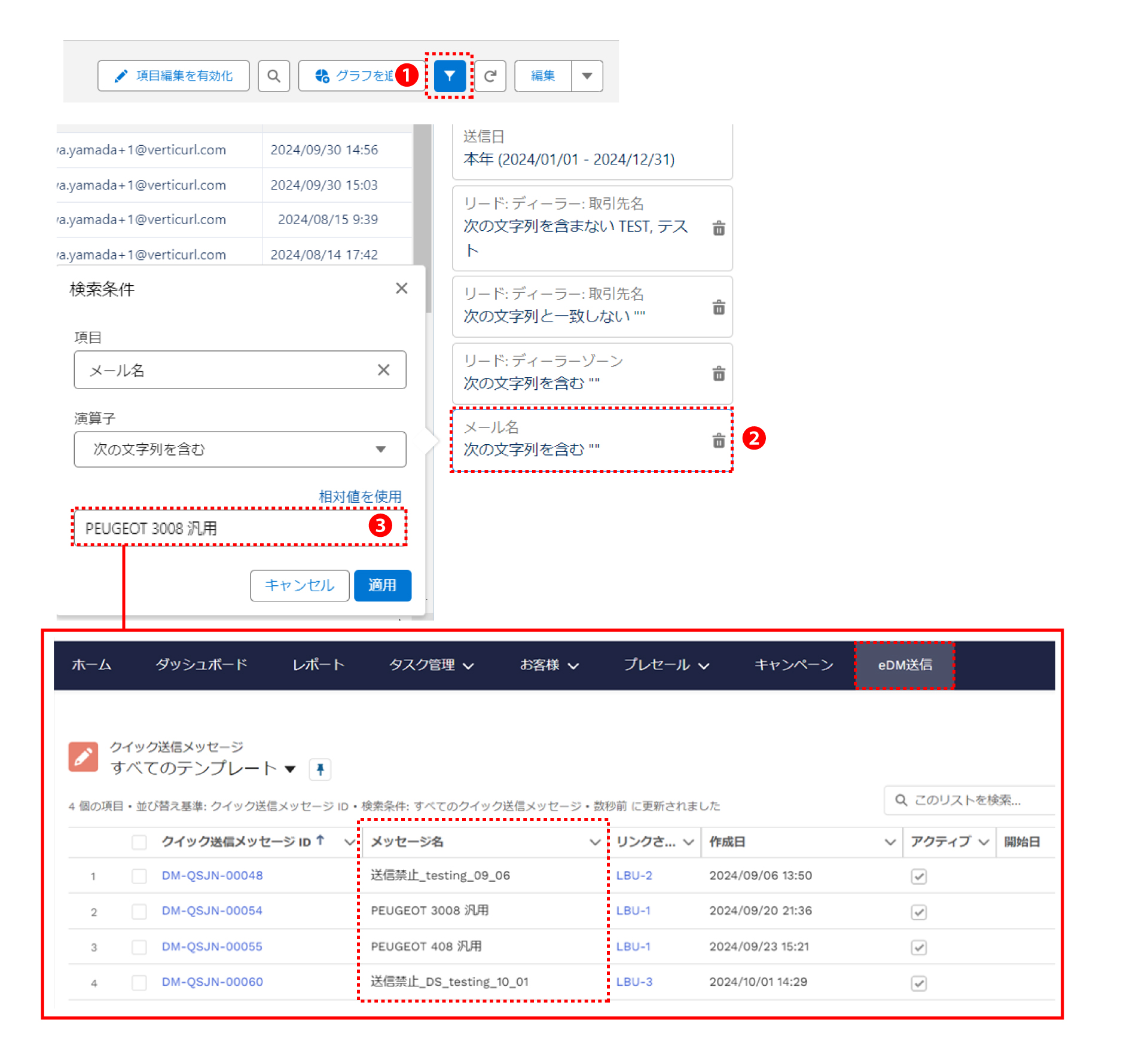 ※「eDM送信」で表示されているeDMテンプレートの「メッセージ名」が「メール名」にあたります。