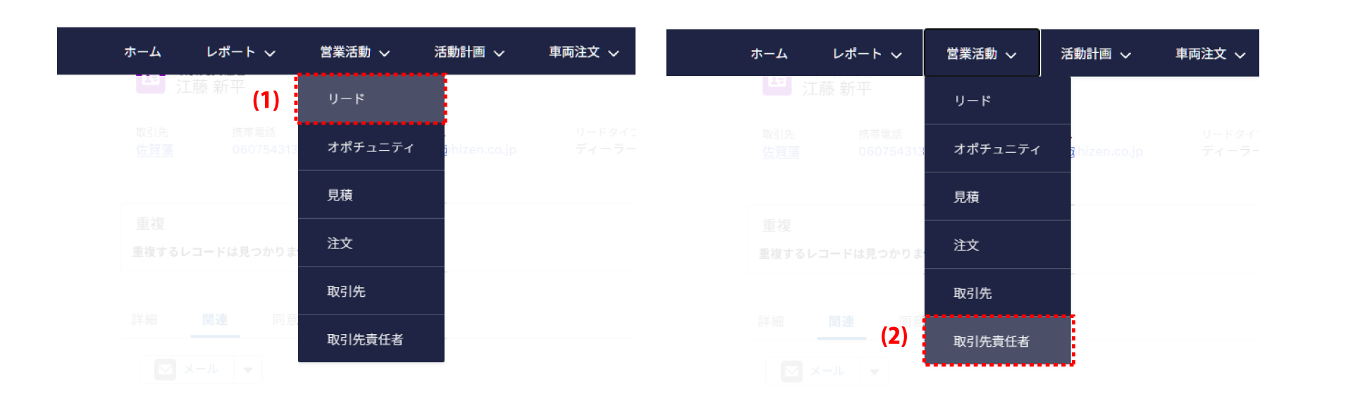 ❶ 該当するお客様のリードまたは取引先責任者画面を開きます。