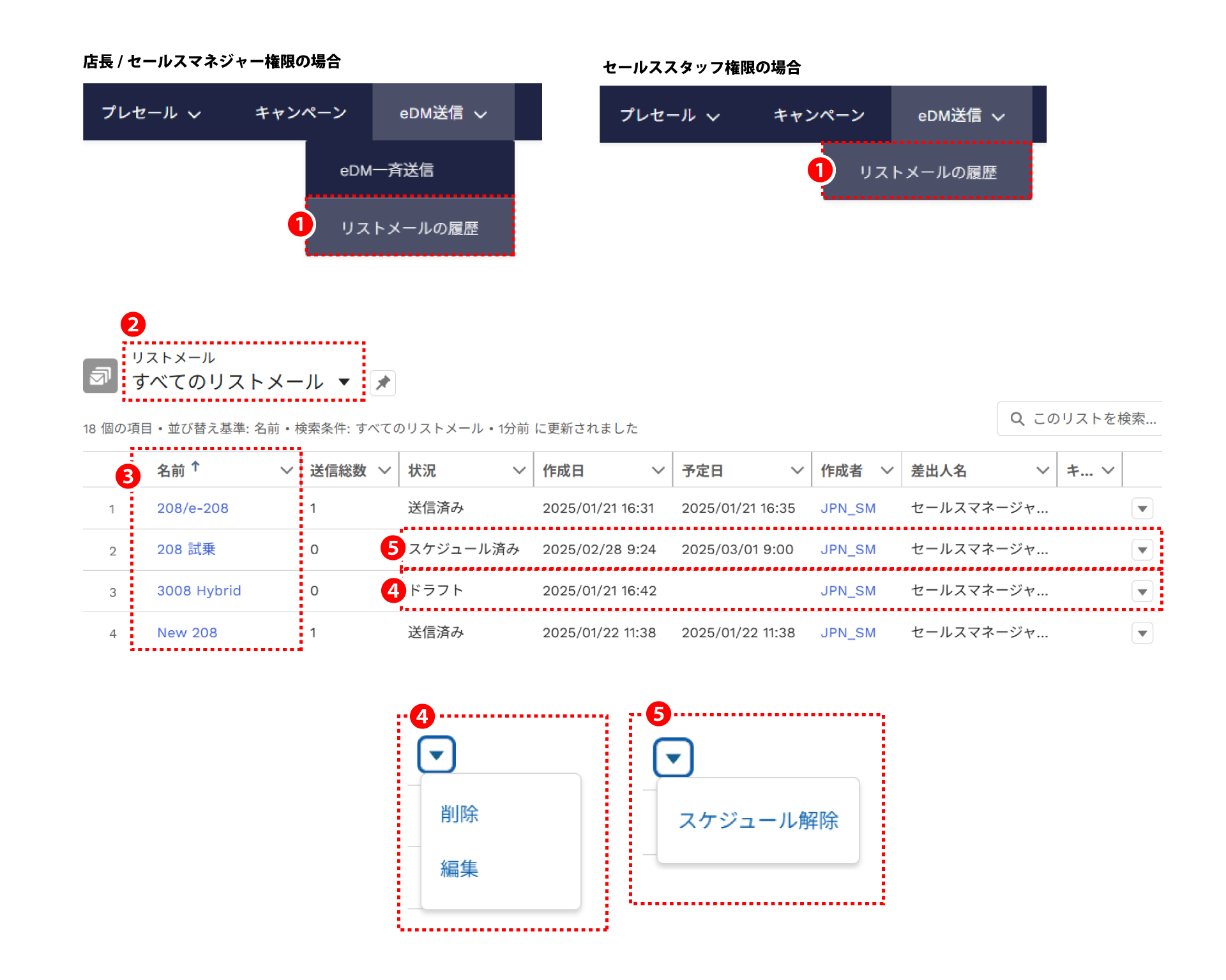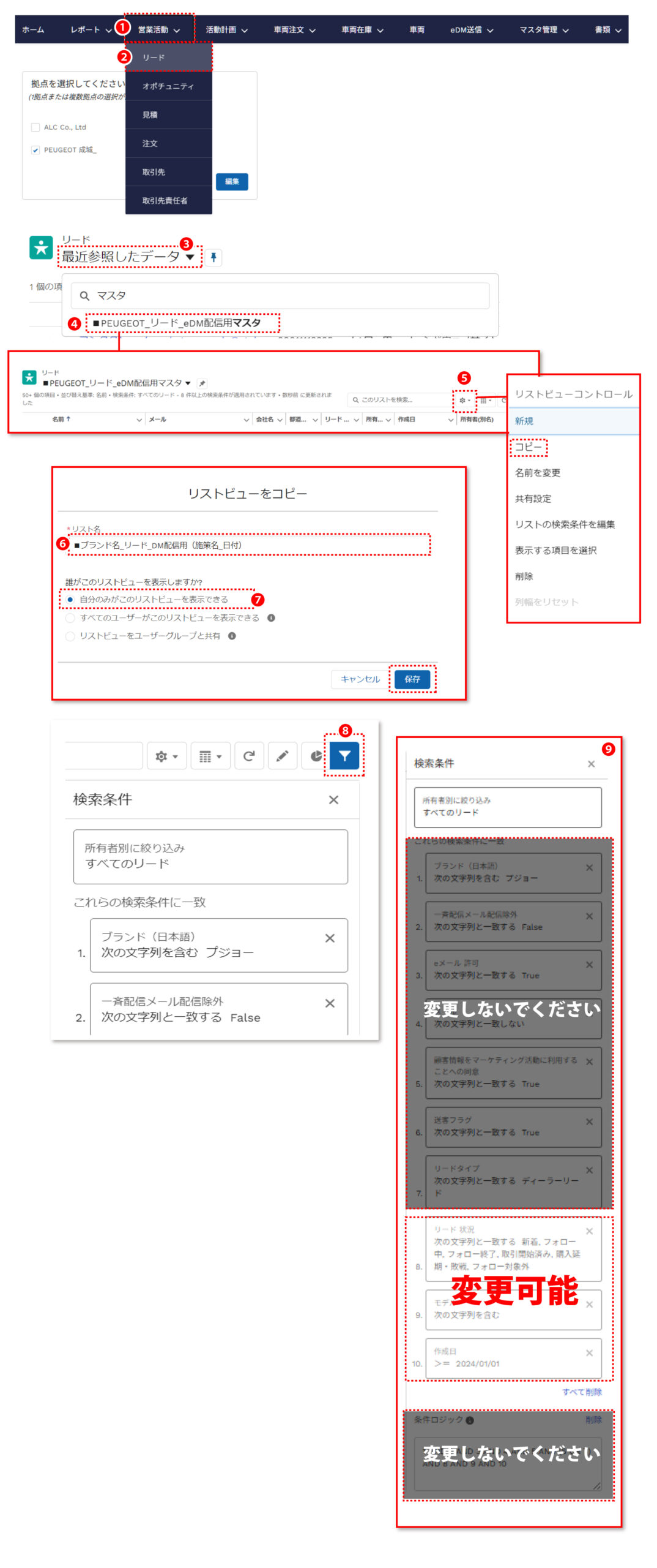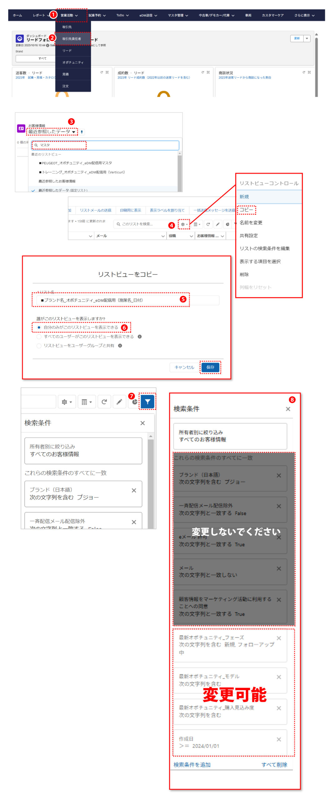 作成したリストを管理し易いように、リスト名は「■ブランド名_オポチュニティ_eDM配信用(送信目的_日付)」のような形式を推奨。 例)PEUGEOT_オポチュニティ_eDM配信用(NEW 208商談_20241201)