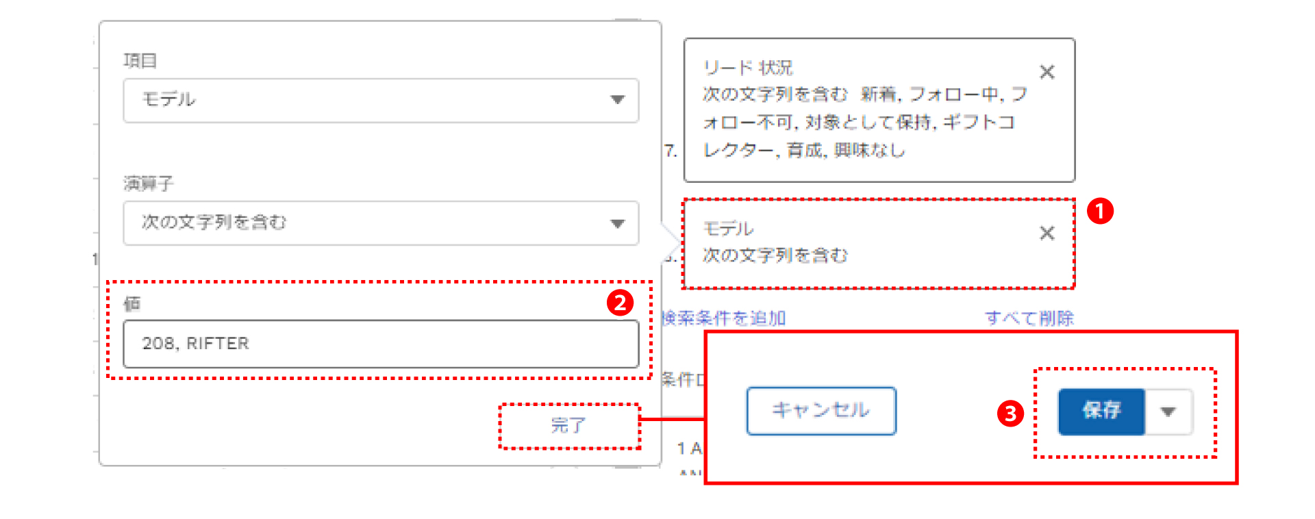 例えば、「208」と「RIFTER」のリードのみが送信先に含められるように変更します。