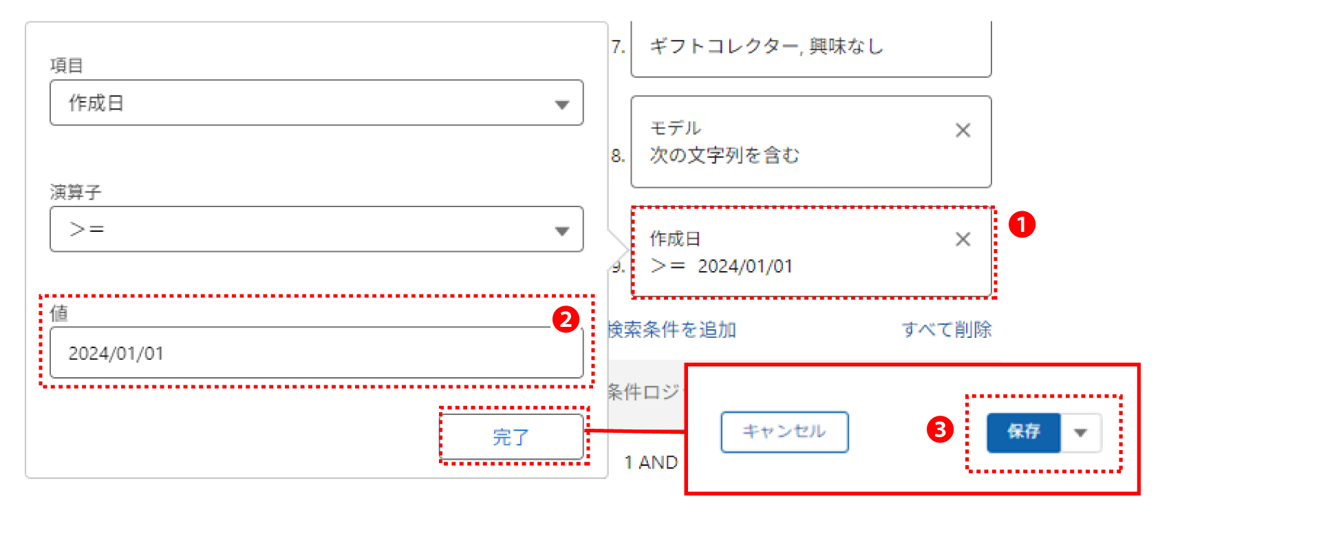 「作成日」の条件を変更する場合