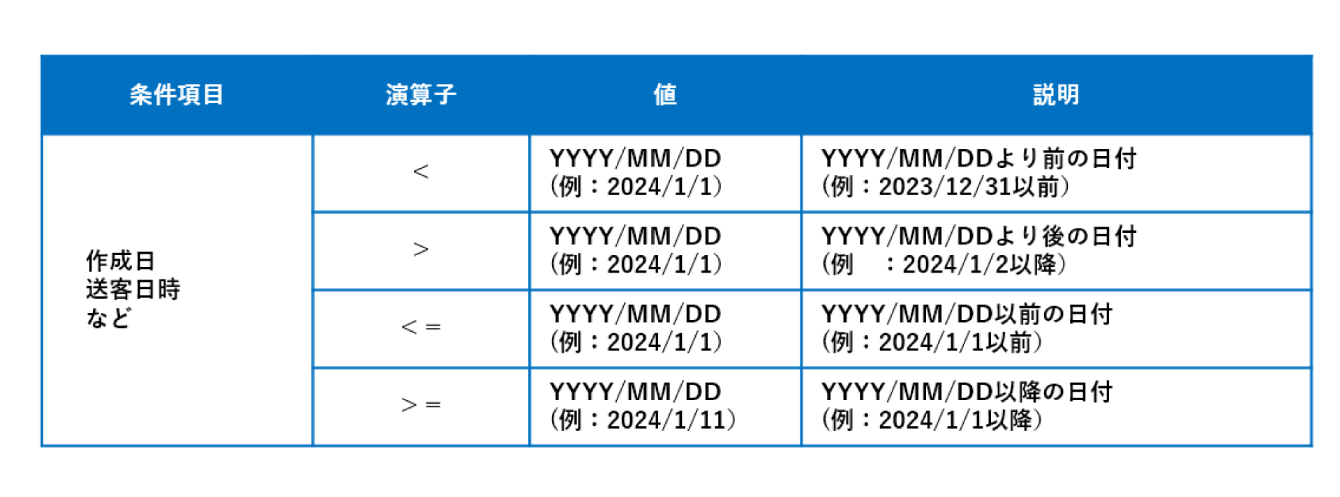 ※作成日、送客日時など日付の項目は、以下の通り条件値を設定することが可能です。