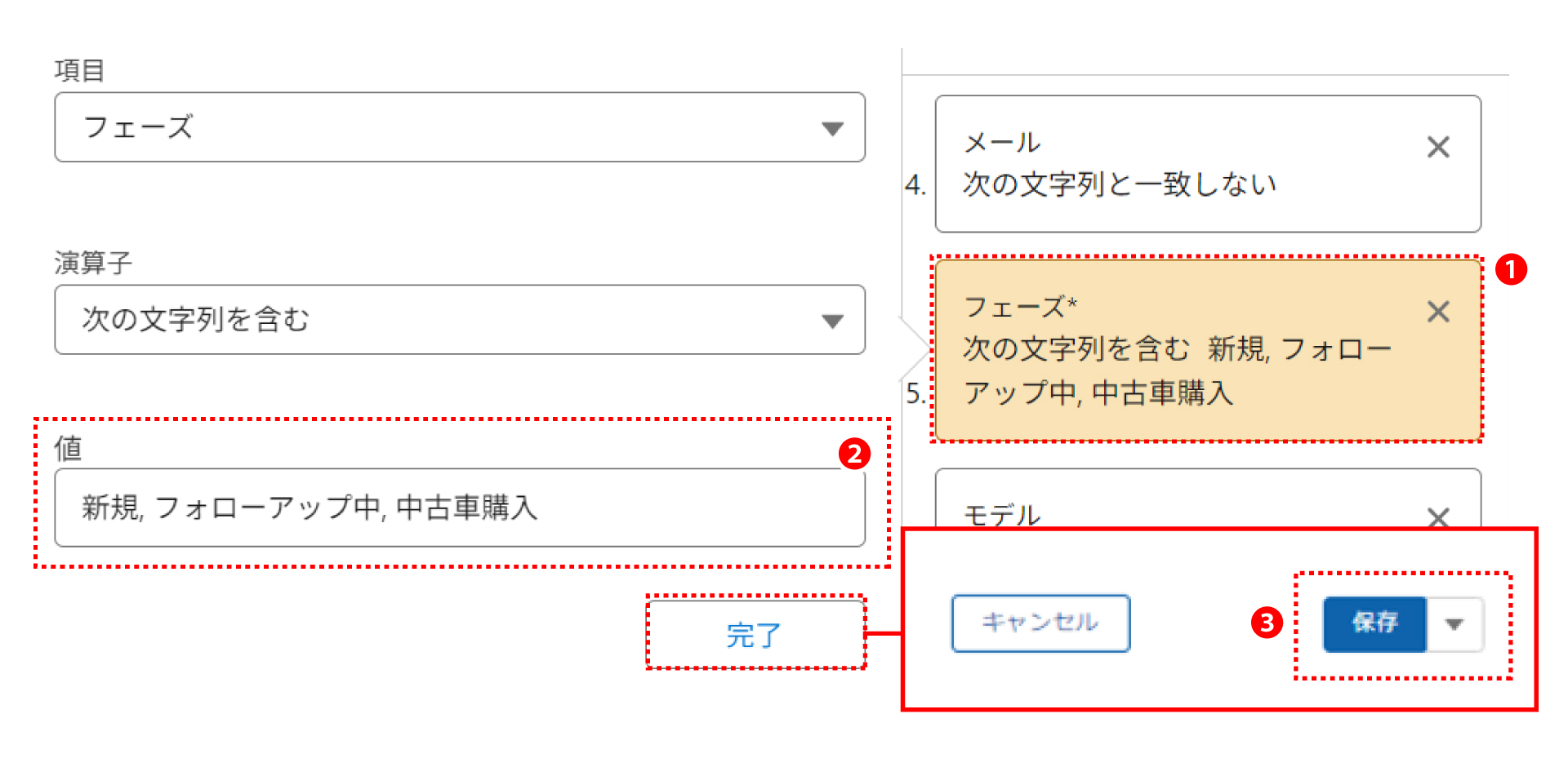 ❷ 左側のウインドウが表示されたら「値」の欄に「新規,フォローアップ中,中古車購入」と入力し、「完了」をクリックします。