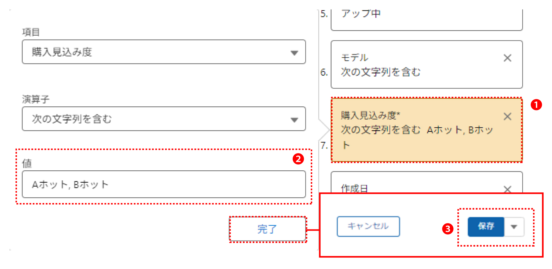 ❶「購入見込み度」の条件欄をクリックします。
