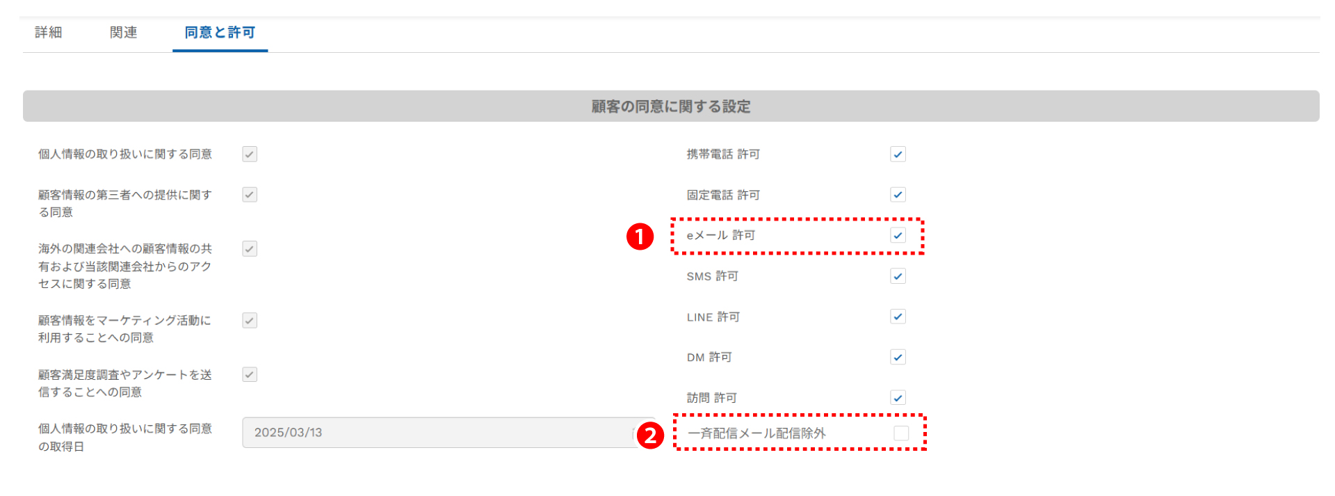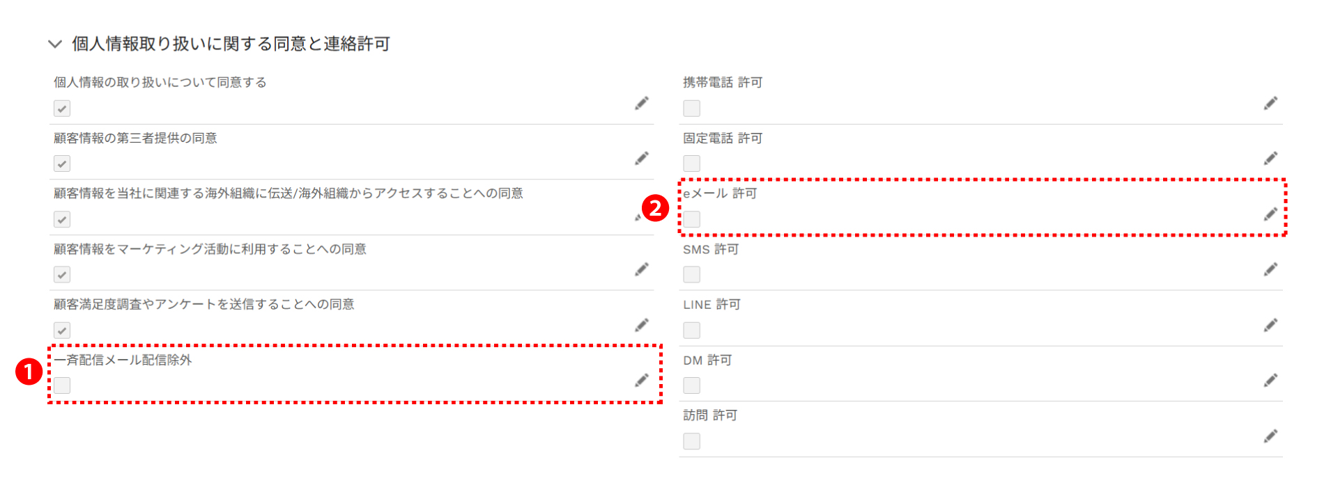 ・お客様が個別のコンタクトを含め、あらゆるメールによる連絡の停止を希望された場合:「eメール 許可」のチェックを外します。
