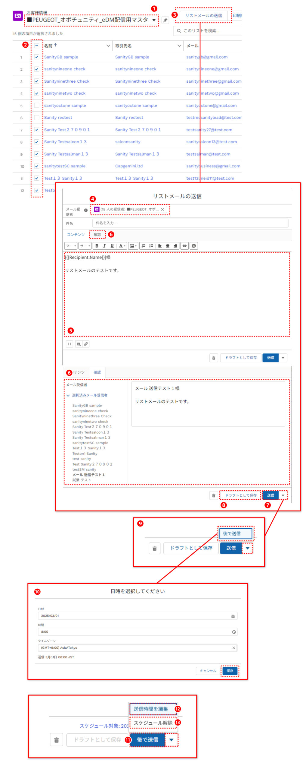 ※Salesforceでは、(1)商談開始前(リード)のお客様と(2)商談開始後(オポチュニティ)のお客様の両方に対して一度にまとめてメールを送信することはできません。両方のお客様に対してメールを送信したい場合には、それぞれで送信先のリストを作成し、 それぞれに対してメールの送信を行う必要があります。