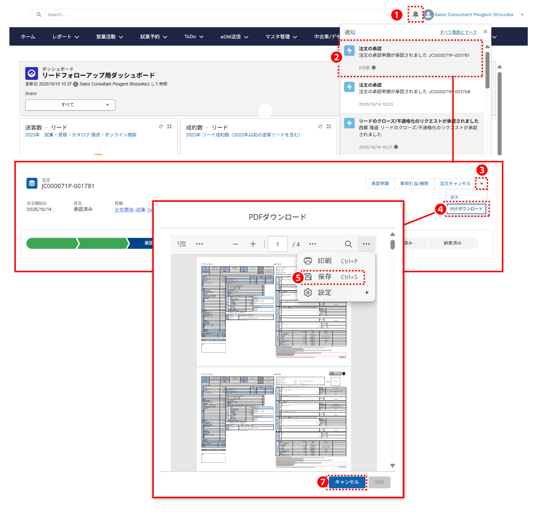 店長/セールスマネジャーから承認を得た注文書のPDFを作成し、お客様に提示します。