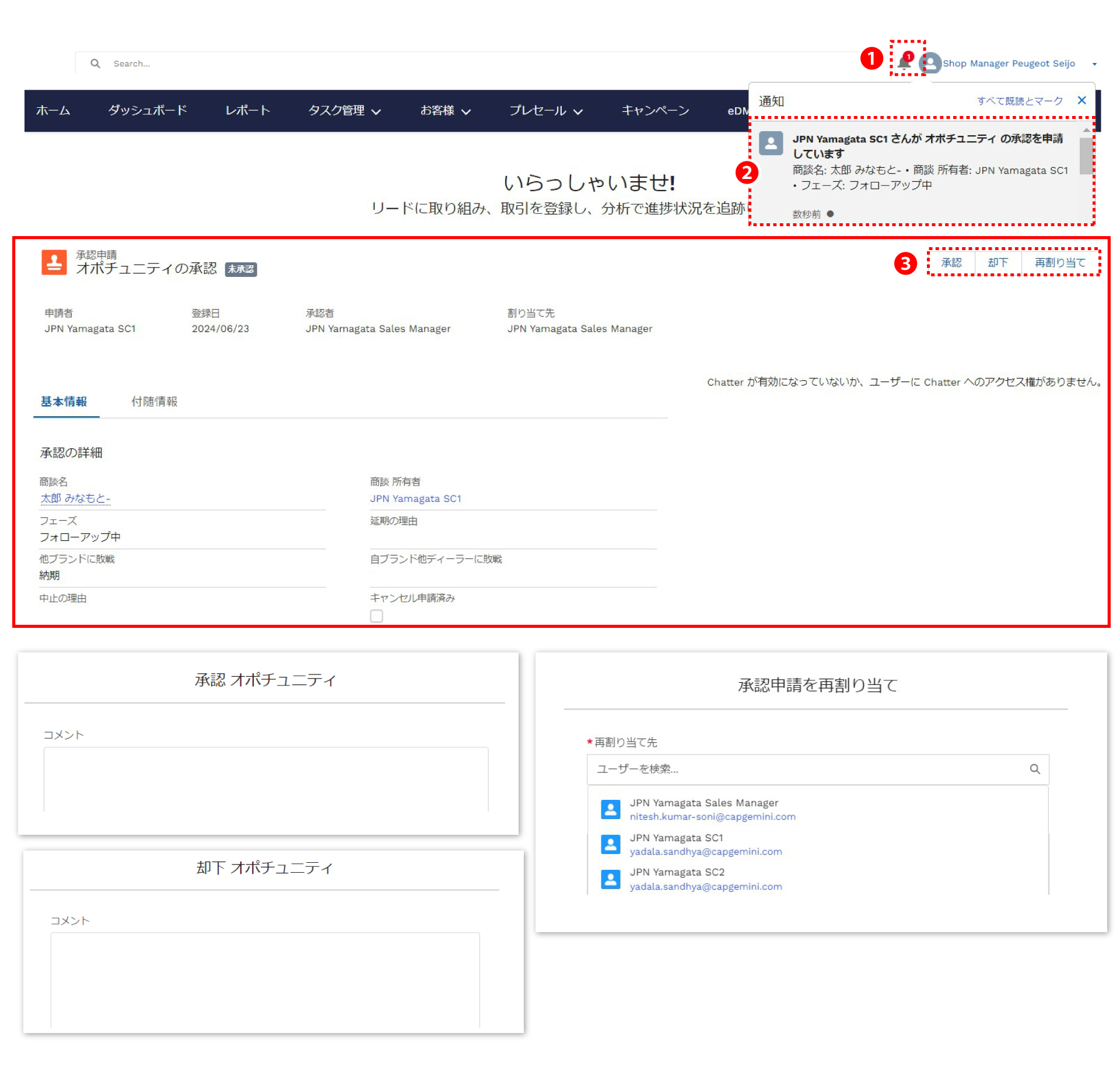 ❸ 店長・セールスマネージャーは、申請内容やオポチュニティの内容/フォローアップ履歴を確認し、承認、却下、またはリードの再割り当てを行います。