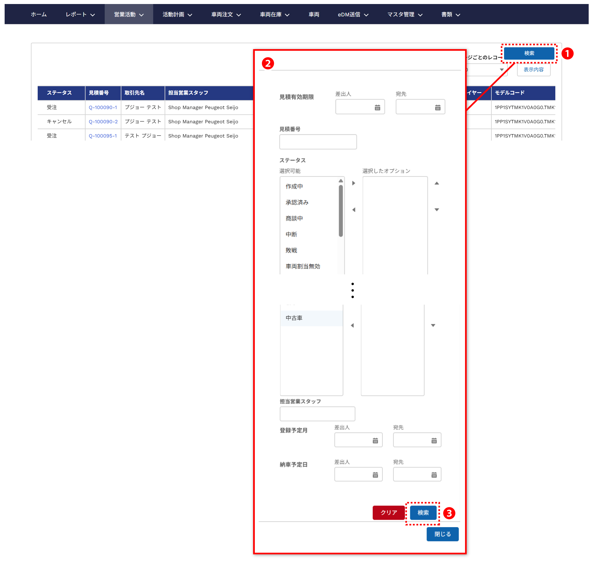 必要な場合、見積一覧から該当する見積を見つけるために検索を実施します。