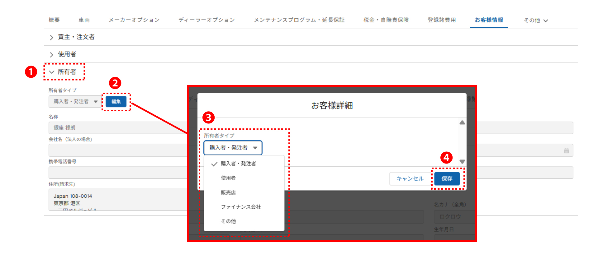 ❸「お客様詳細」画面が立ち上がるので、「所有者タイプ」の該当する選択肢をクリックします。