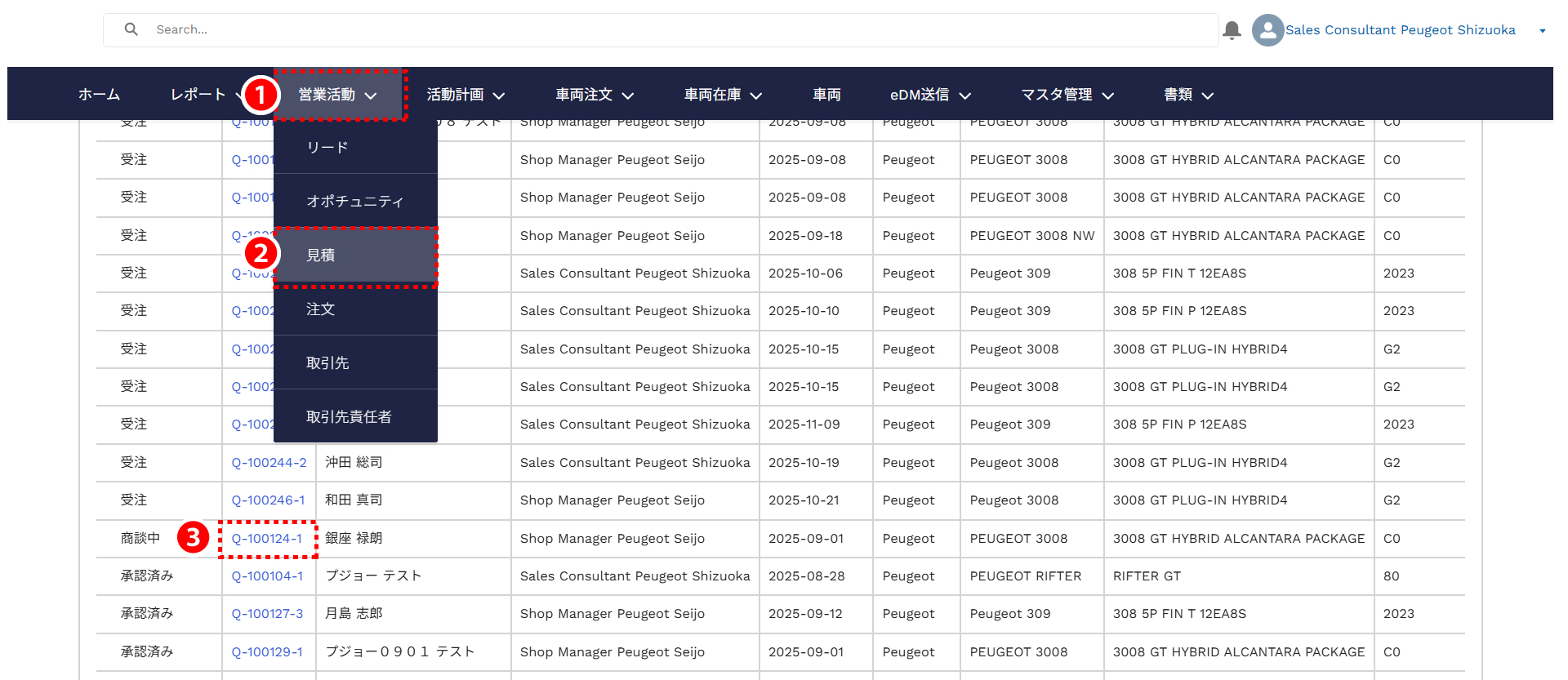 ❸ 見積一覧が表示されたら、該当する見積(ステータスは「商談中」)の「見積番号(青文字)」をクリックします。