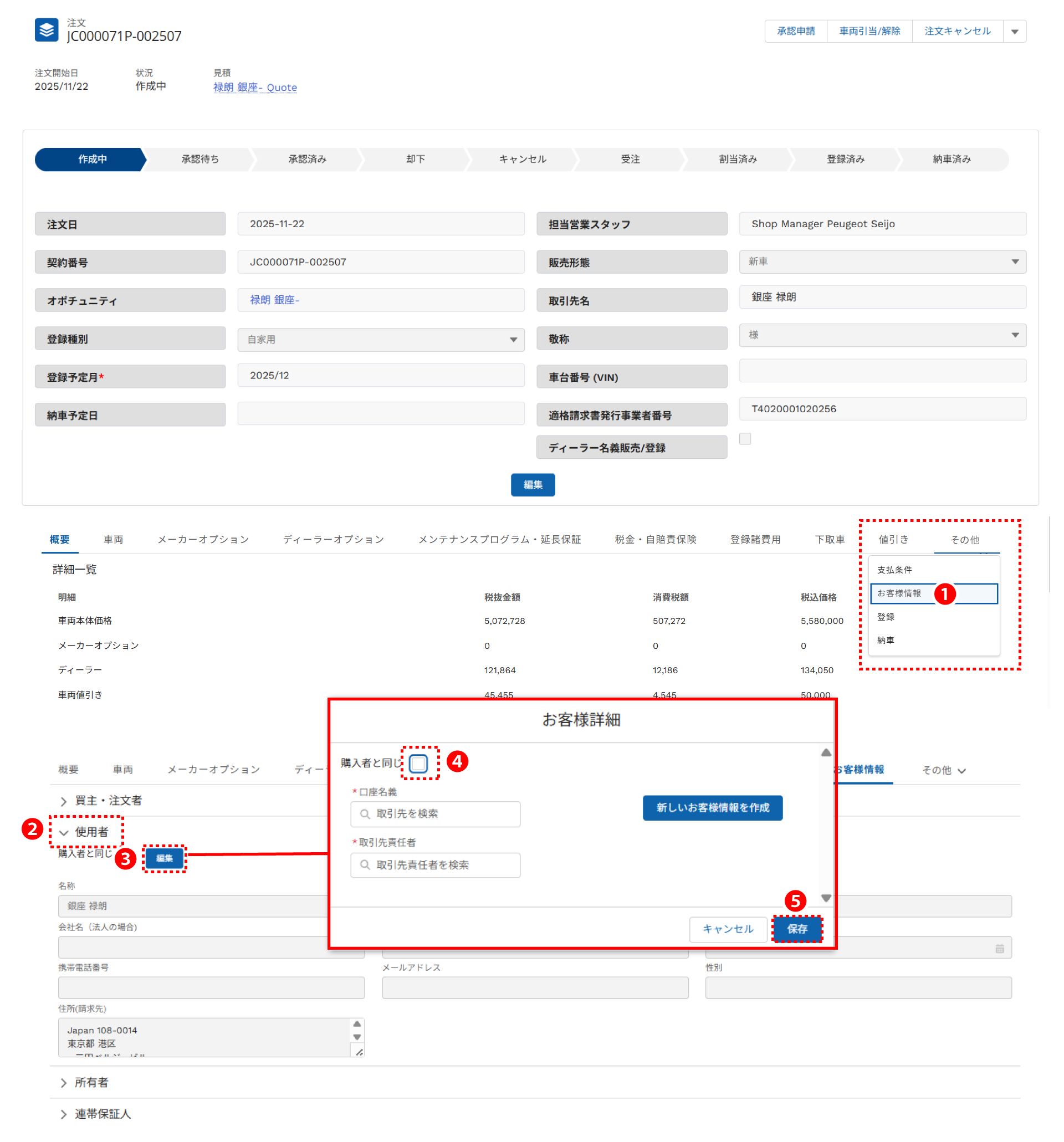 車両の使用者が購入者と異なる場合、使用者となるお客様の情報を入力します。