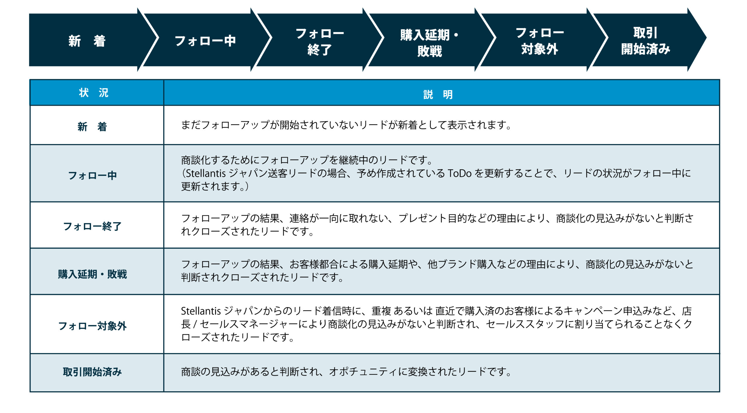 ①Stellantisジャパン(コールセンター)がリードを作成し、お客様のご要望や居住地に基づきディーラーにリードが割り振られます。