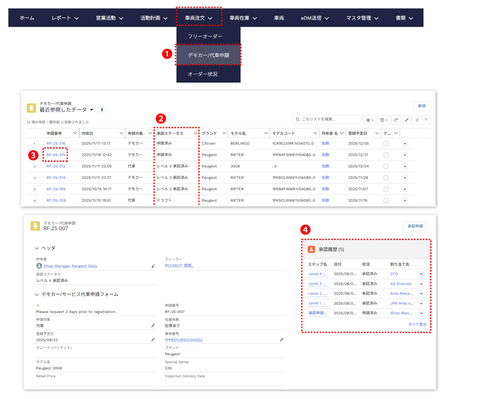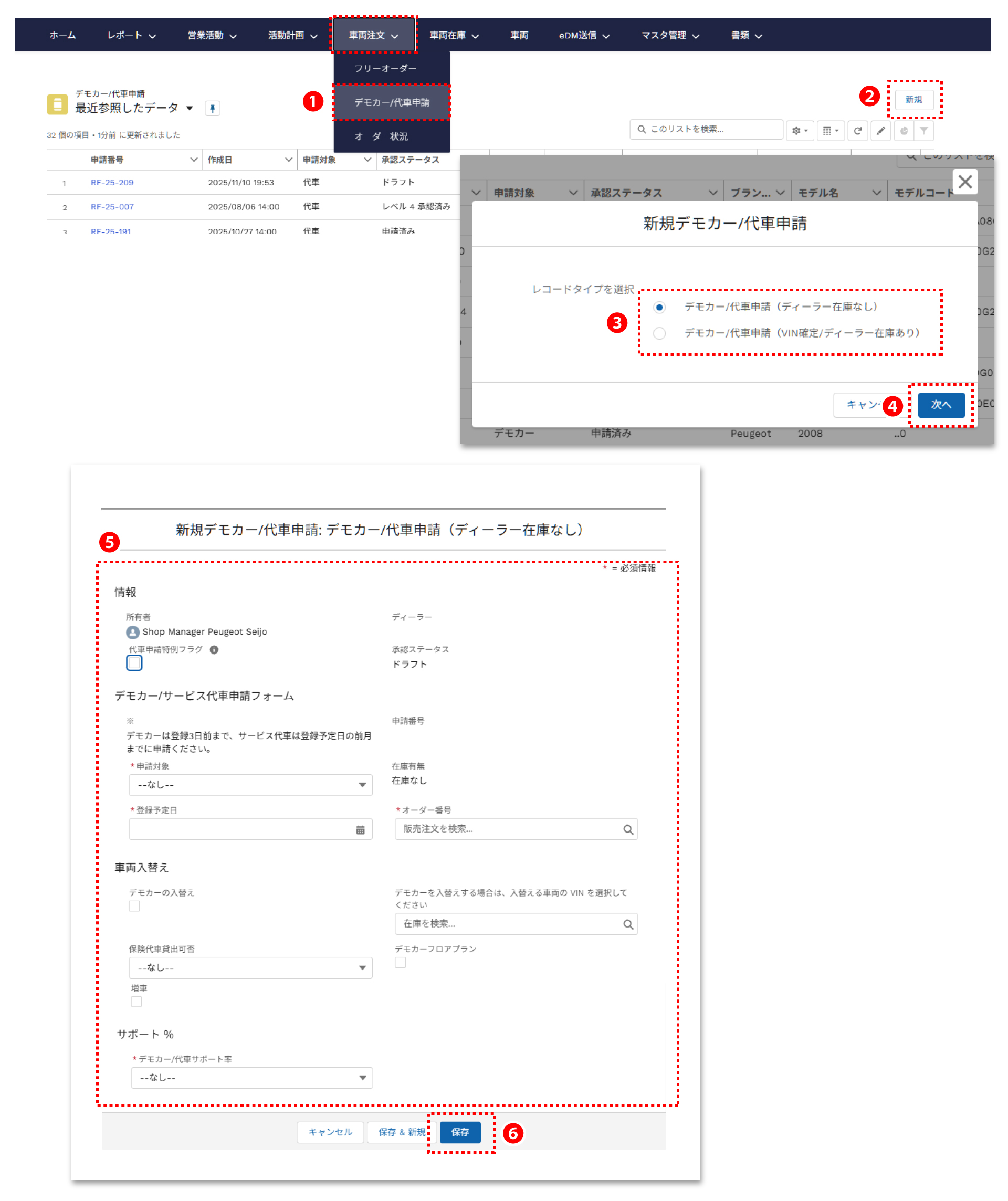 自社在庫又は、オーダー済み在庫をデモカー/サービス代車として登録する際のサポート申請をStellantisジャパンに提出します。