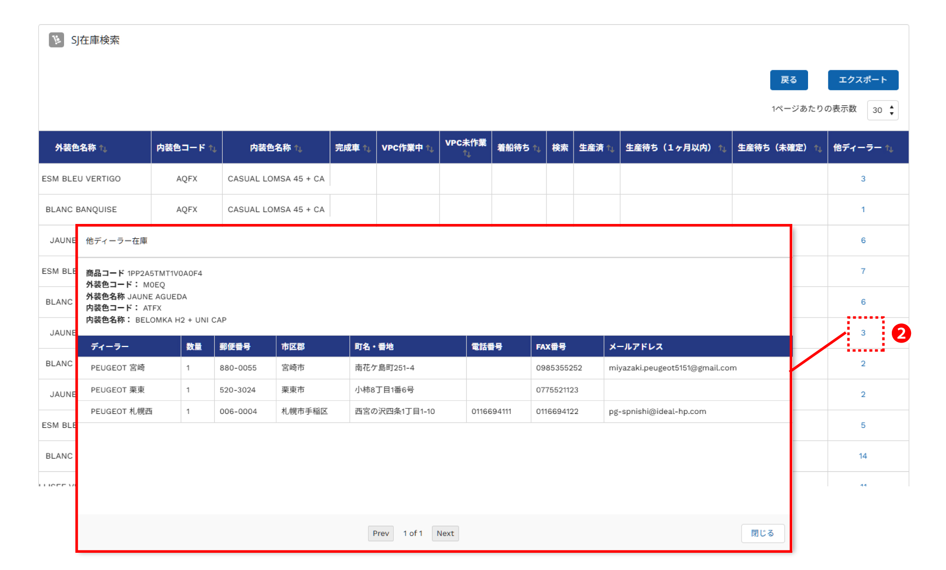 ❷「他ディーラー」欄に数字が表示されている場合は、在庫があるので、数字(青文字)クリックすると在庫を持っているディーラーが表示されます。