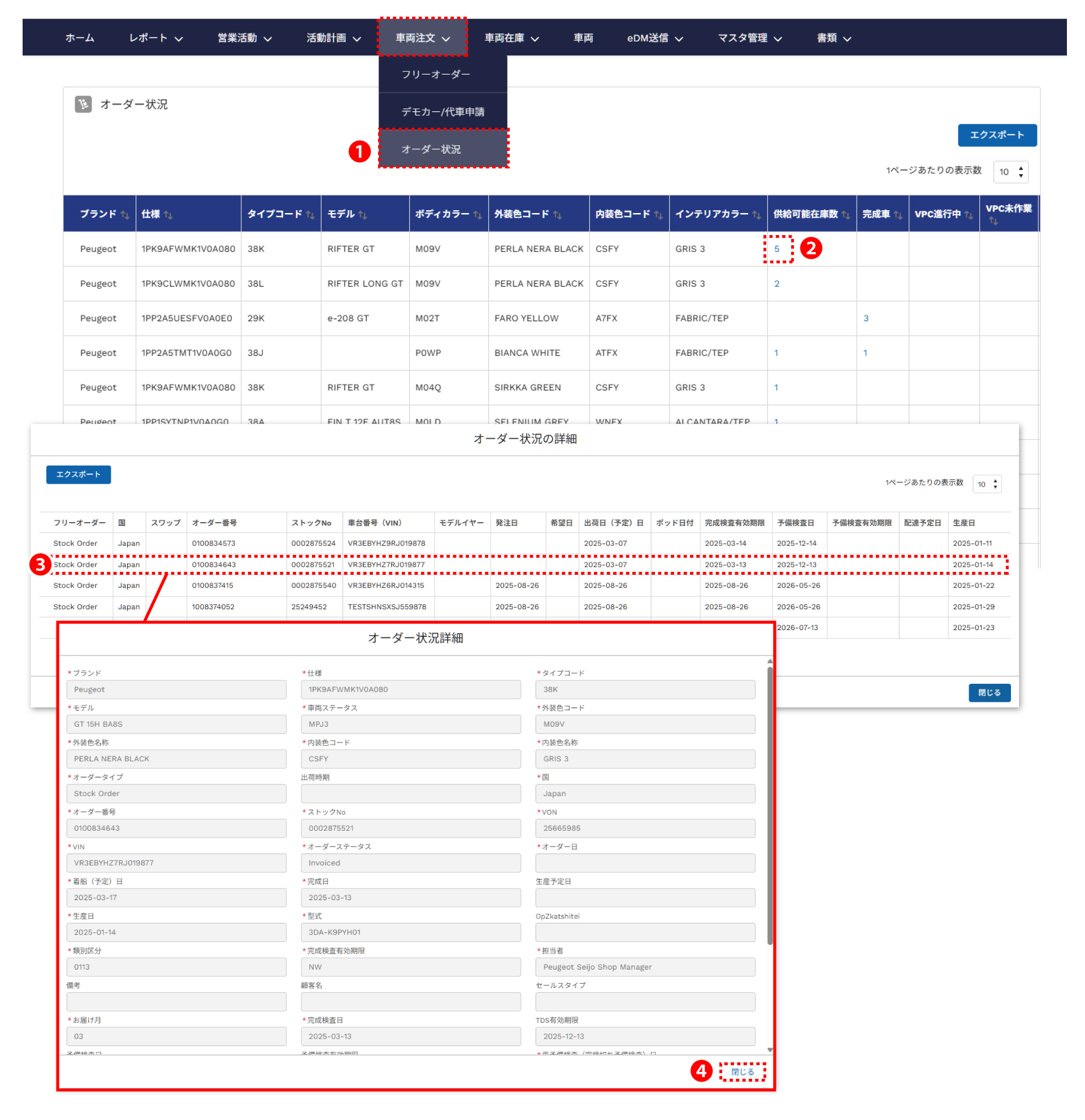 ❹ 在庫車両一覧の数値ををクリックすると注文情報の詳細画面が表示されます。