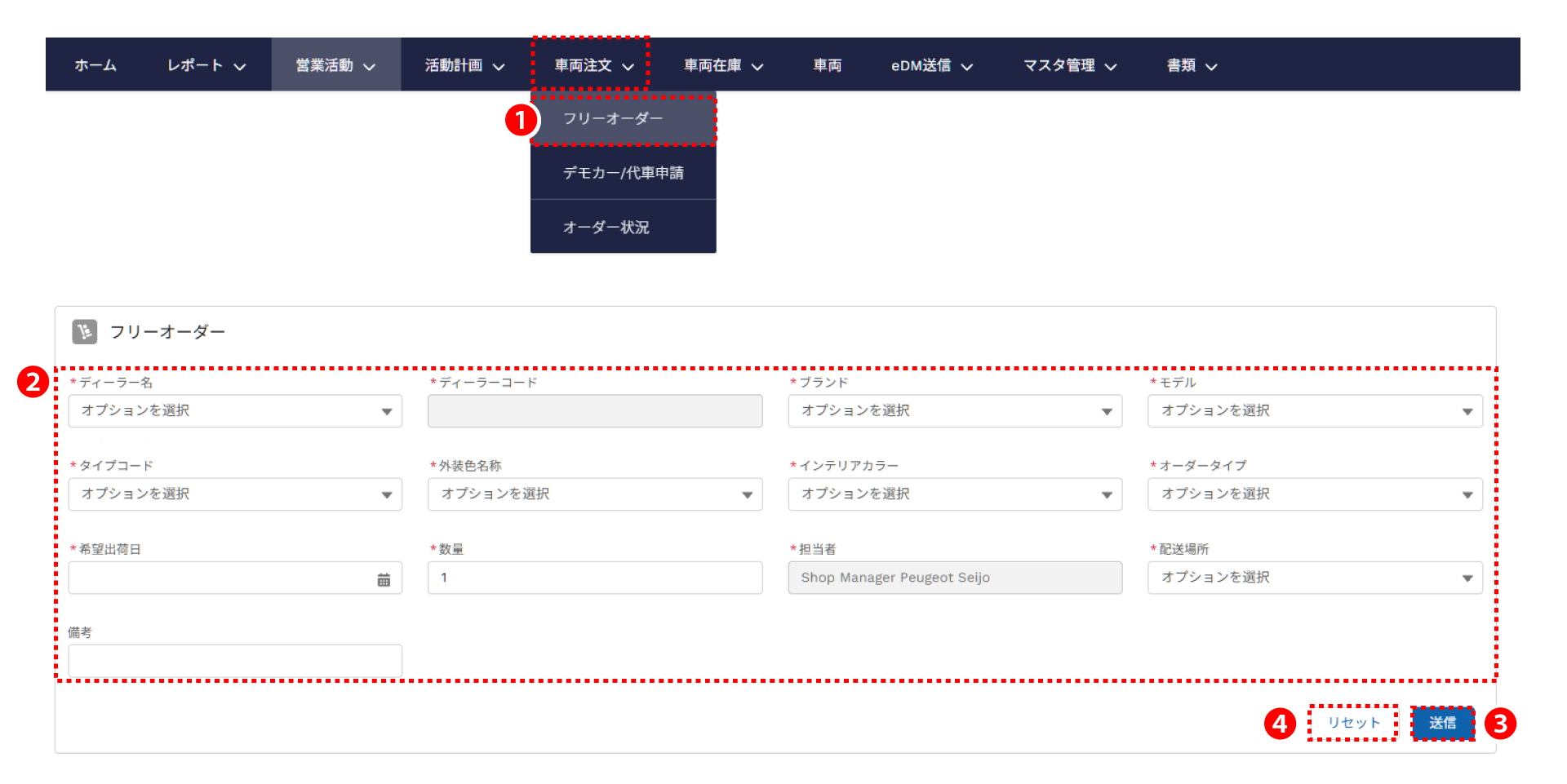 ❶ メニューバーの「車両注文」をクリックし、「フリーオーダー」をクリックします。