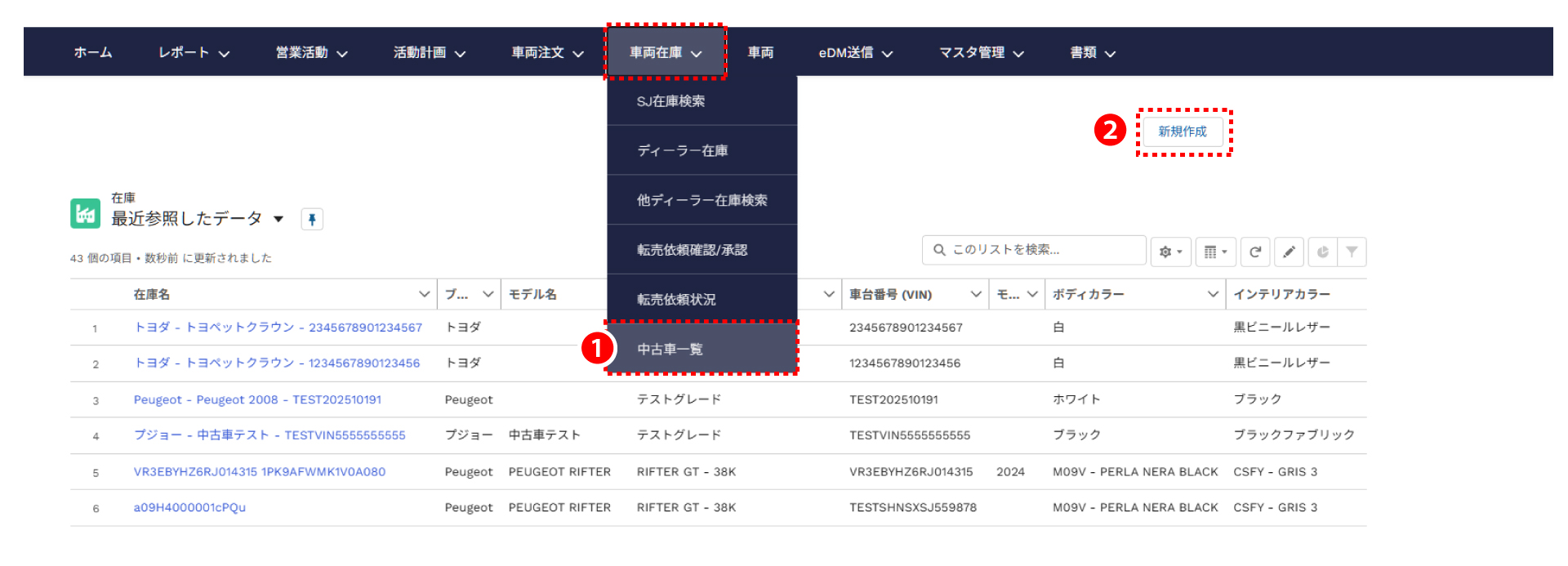 ❷ 中古車一覧が表示されたら、右上部の「新規作成」をクリックし、登録画面を立ち上げます。​