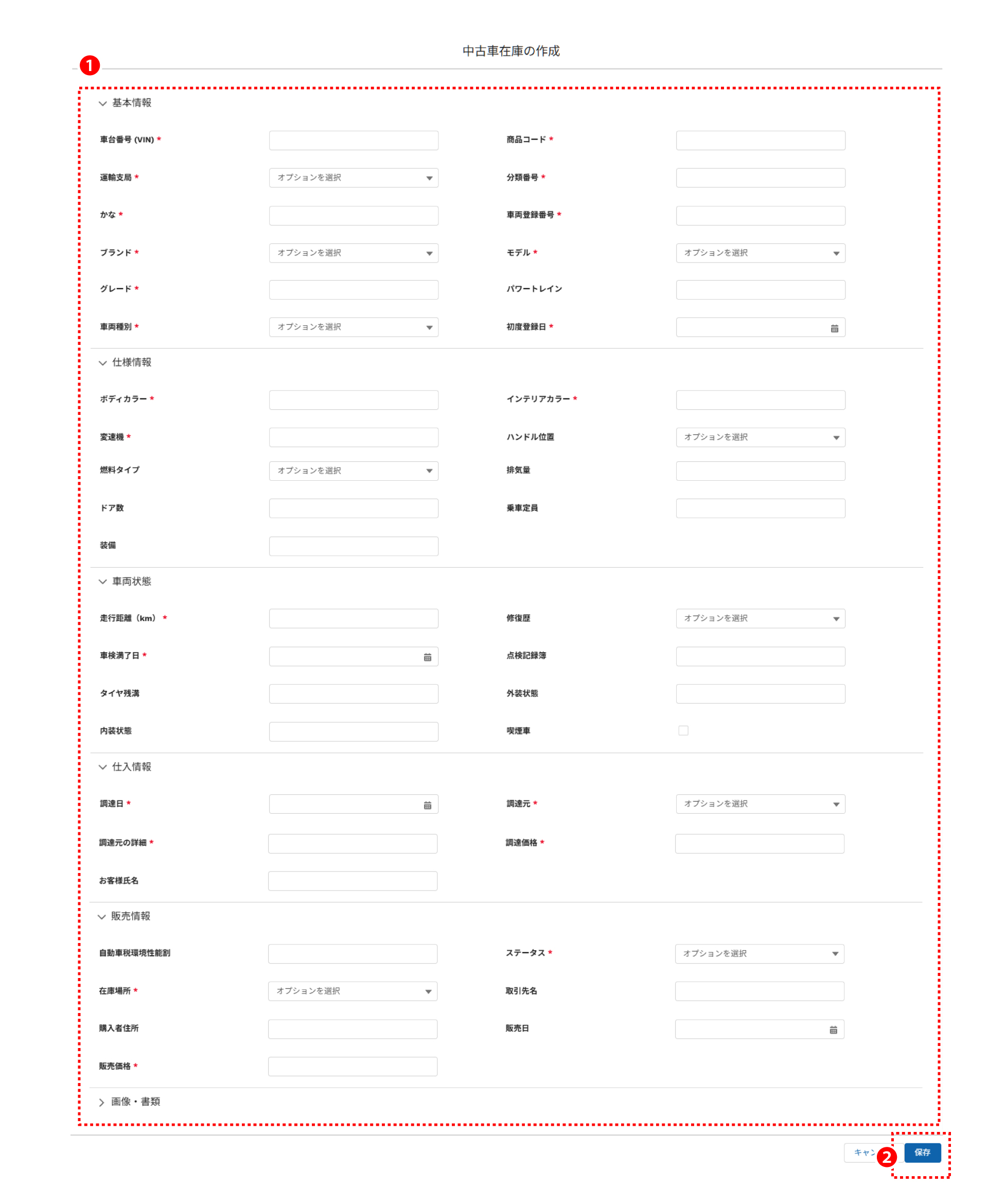❶「中古在庫の作成」画面で必須の項目を登録します。​